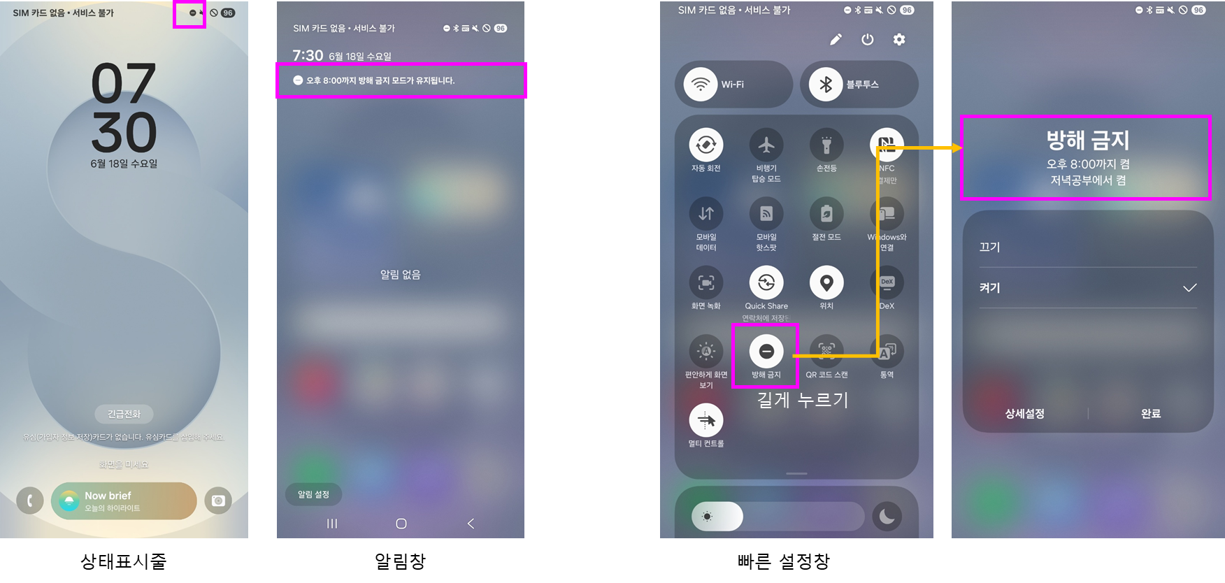 방해금지 모드가 활성화되면 상태표시줄, 알림창, 빠른 설정창에서 언제든지 확인할 수 있습니다.