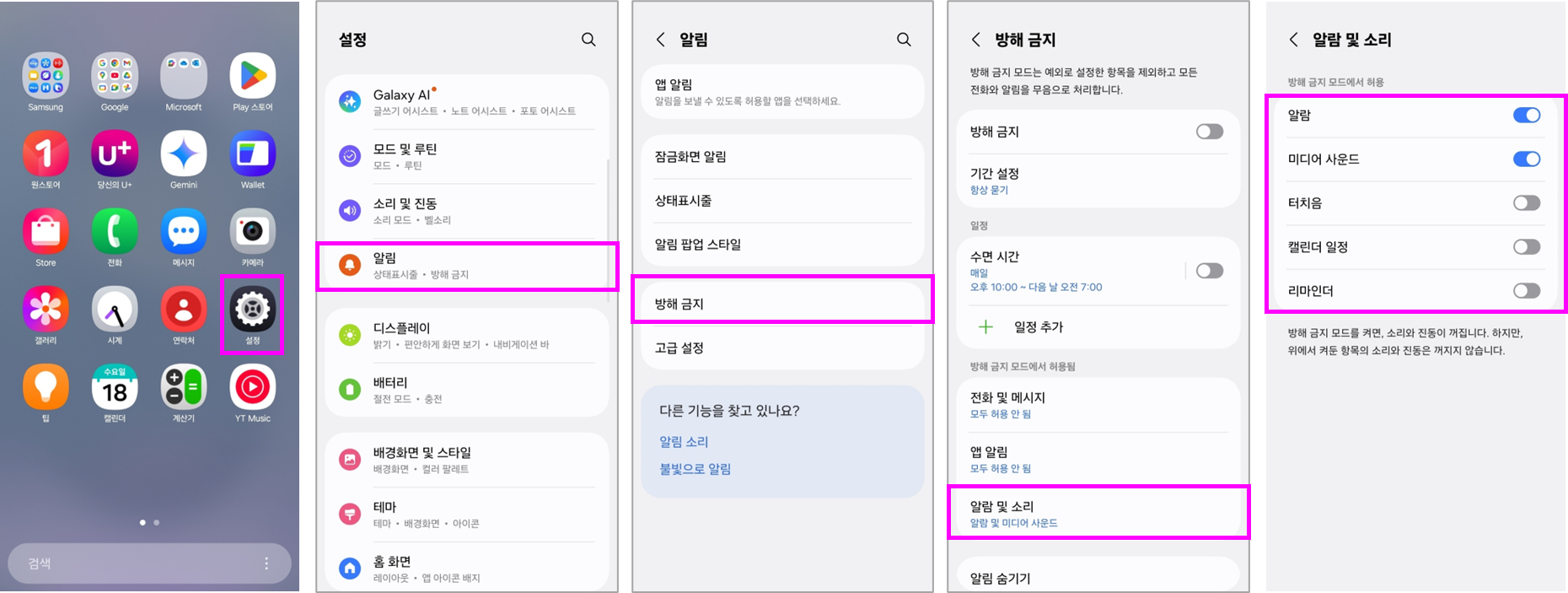 방해금지 모드 사용 중 알람, 미디어 사운드, 터치음, 캘린더 일정, 리마인더를 허용할지 여부를 선택합니다.