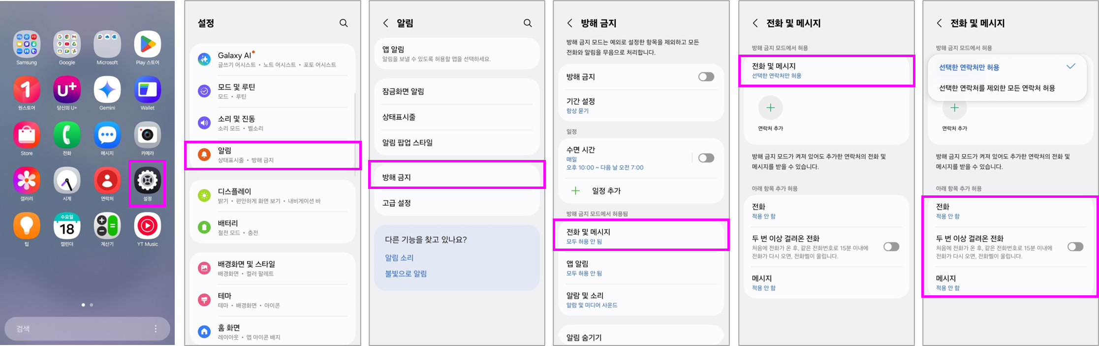 저장된 연락처, 즐겨찾는 연락처에서 온 전화나 메시지, 또는 두 번 이상 연속으로 전화가 올 경우만 알림을 허용할 수 있습니다.