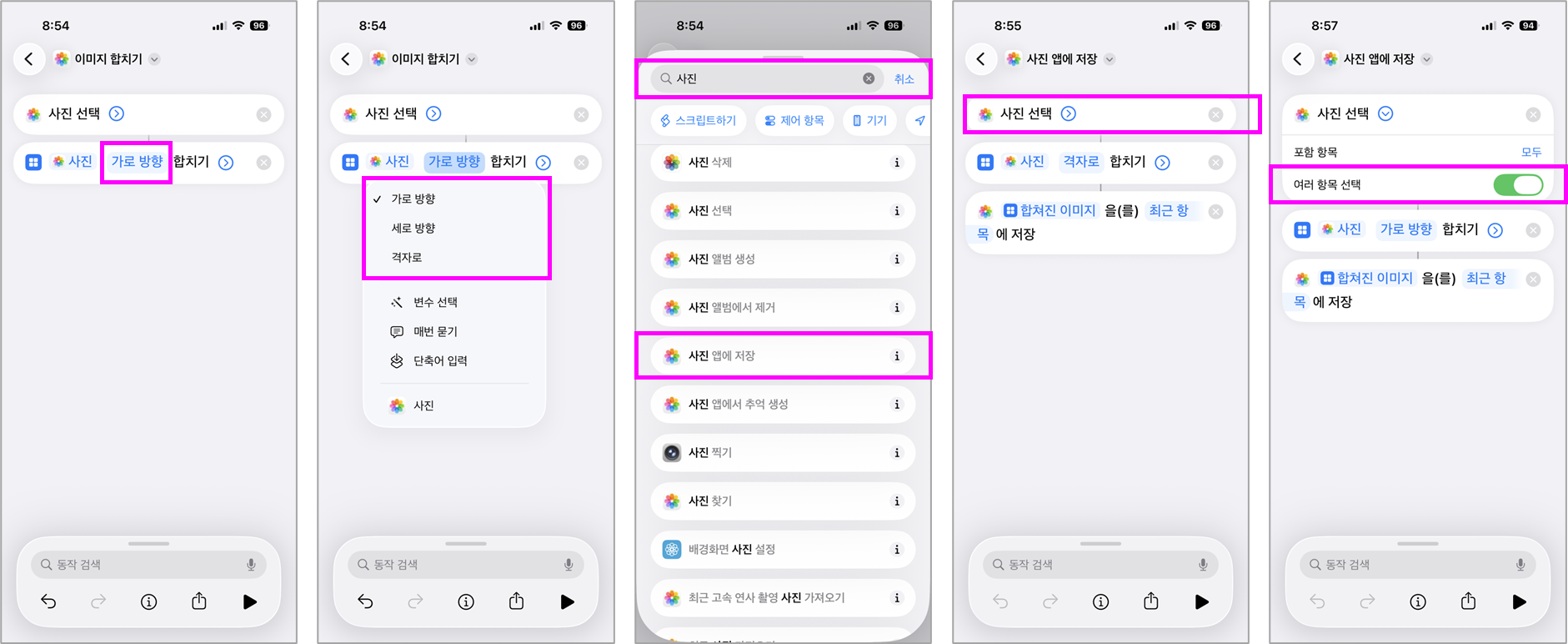 단축어 또는 앱에서 사진을 선택할 때, 원하는 순서로 선택하면 그 순서대로 합쳐집니다.