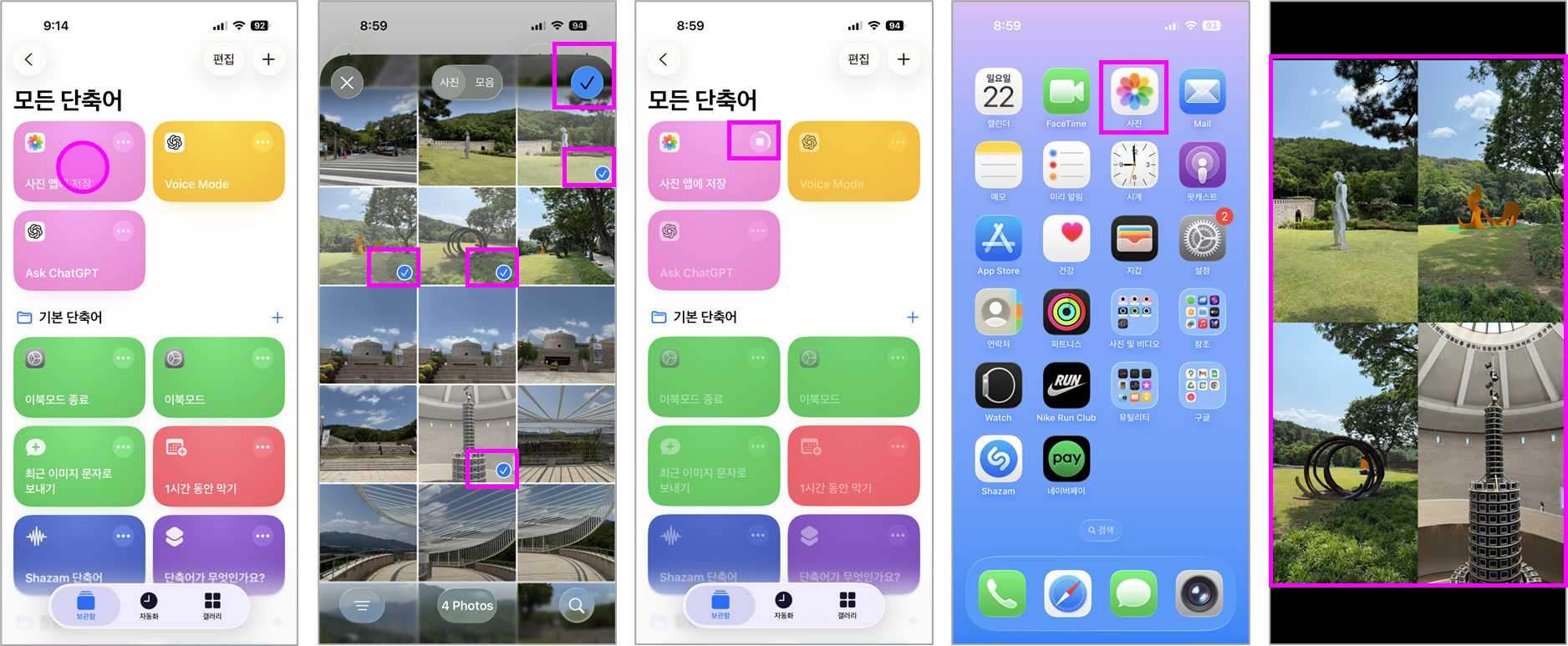 '사진' 앱과 '단축어' 앱에서는 사진을 2장 이상을 한 번에 합칠 수 있어 작업 시간을 대폭 줄일 수 있습니다.