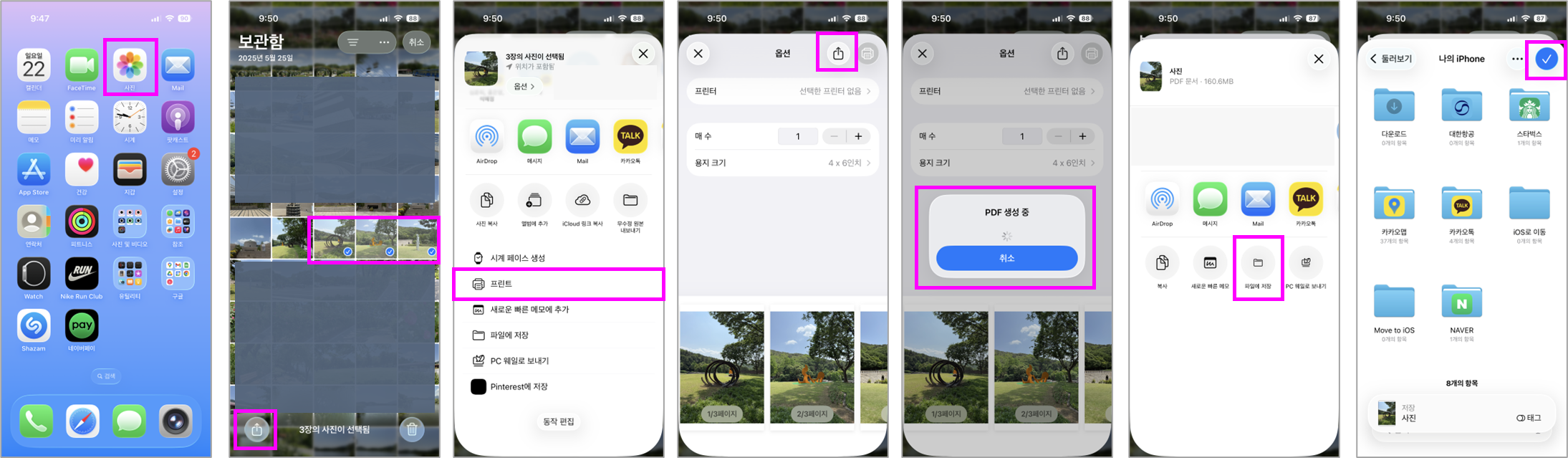 ③ '프린트'(Print) 기능을 선택한 뒤 미리보기 화면에서 우측 상단의 '공유' 버튼을 눌러주면 PDF 생성을 시작합니다.