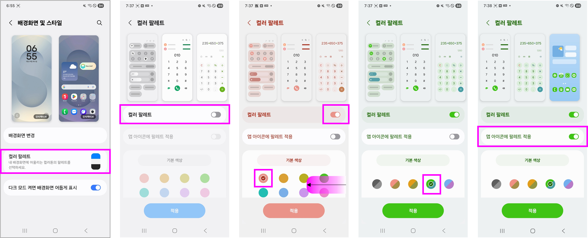 ※ '앱 아이콘에 팔레트 적용' 옵션을 사용하면 앱 아이콘도 원하는 색으로 바꿀 수 있습니다.