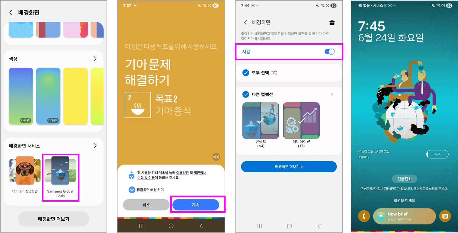 삼성에서 사회 환원을 위해 제공하는 배경화면 서비스로 Samsung Global Goals를 통해 광고를 보면 모아진 광고 수익을 기부하게 됩니다.
