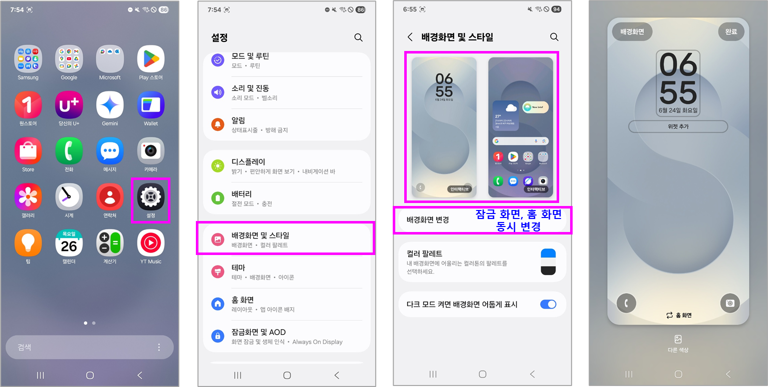 잠금 화면, 홈 화면을 동시에 바꾸려면 '배경화면 변경' 메뉴를 선택합니다.