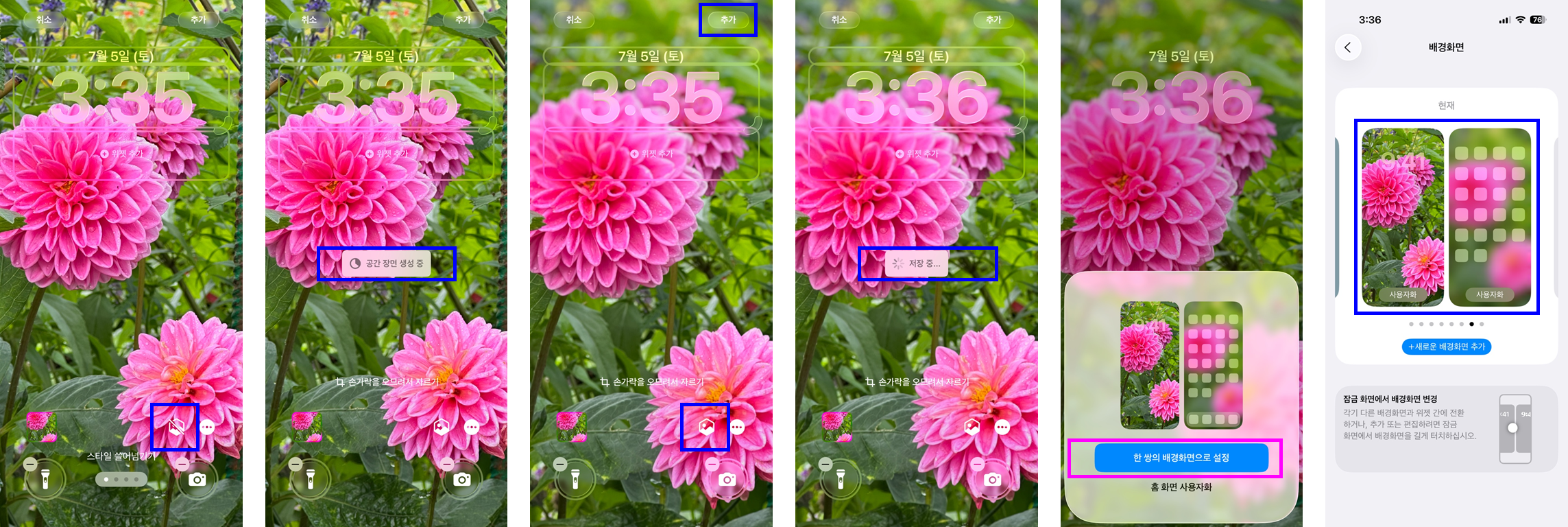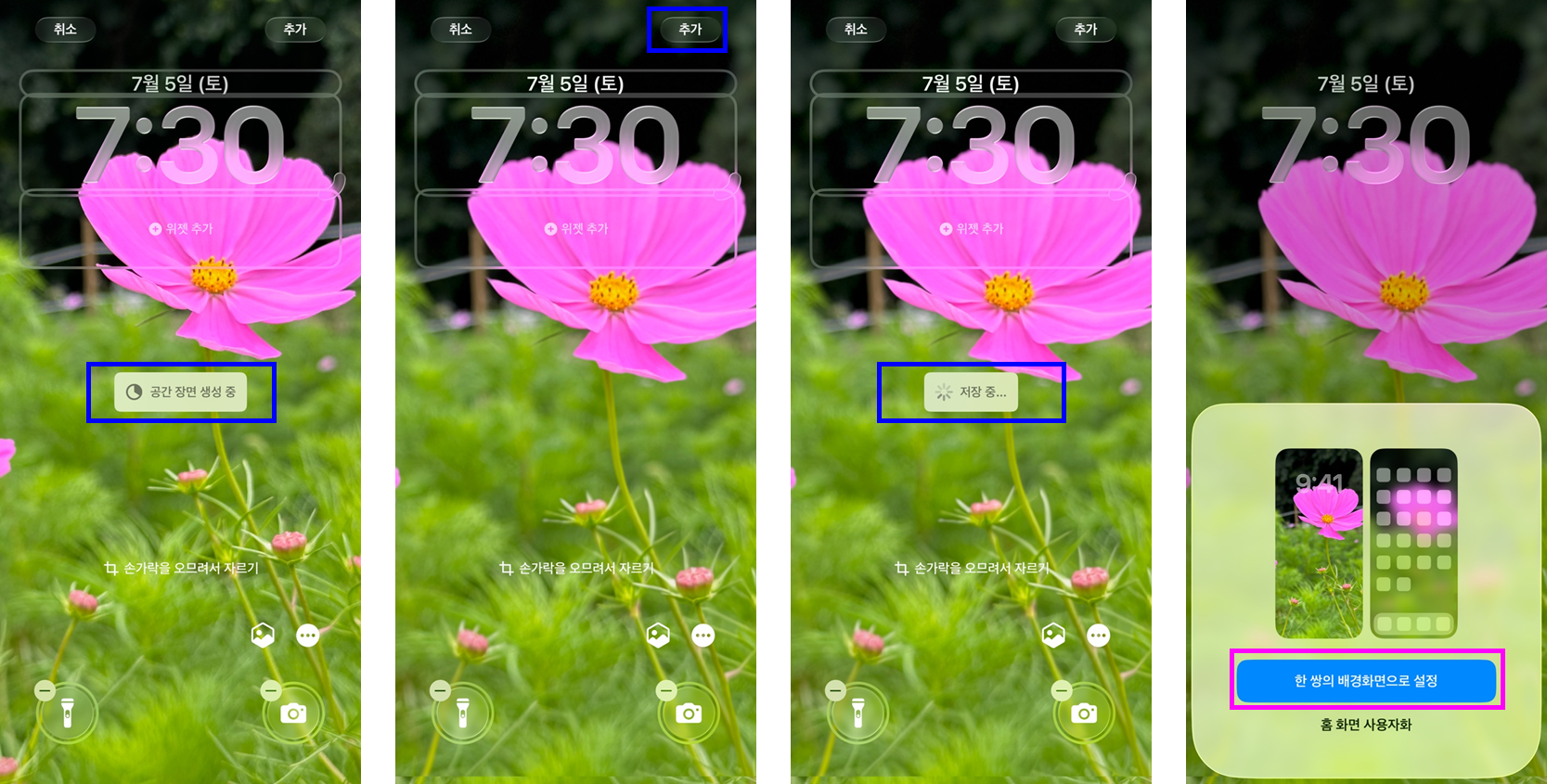 동기화를 원하면 '한 쌍의 배경화면으로 설정'을, 잠금 화면과 별개인 홈 화면을 원하면 '홈 화면 사용자화'를 선택합니다.