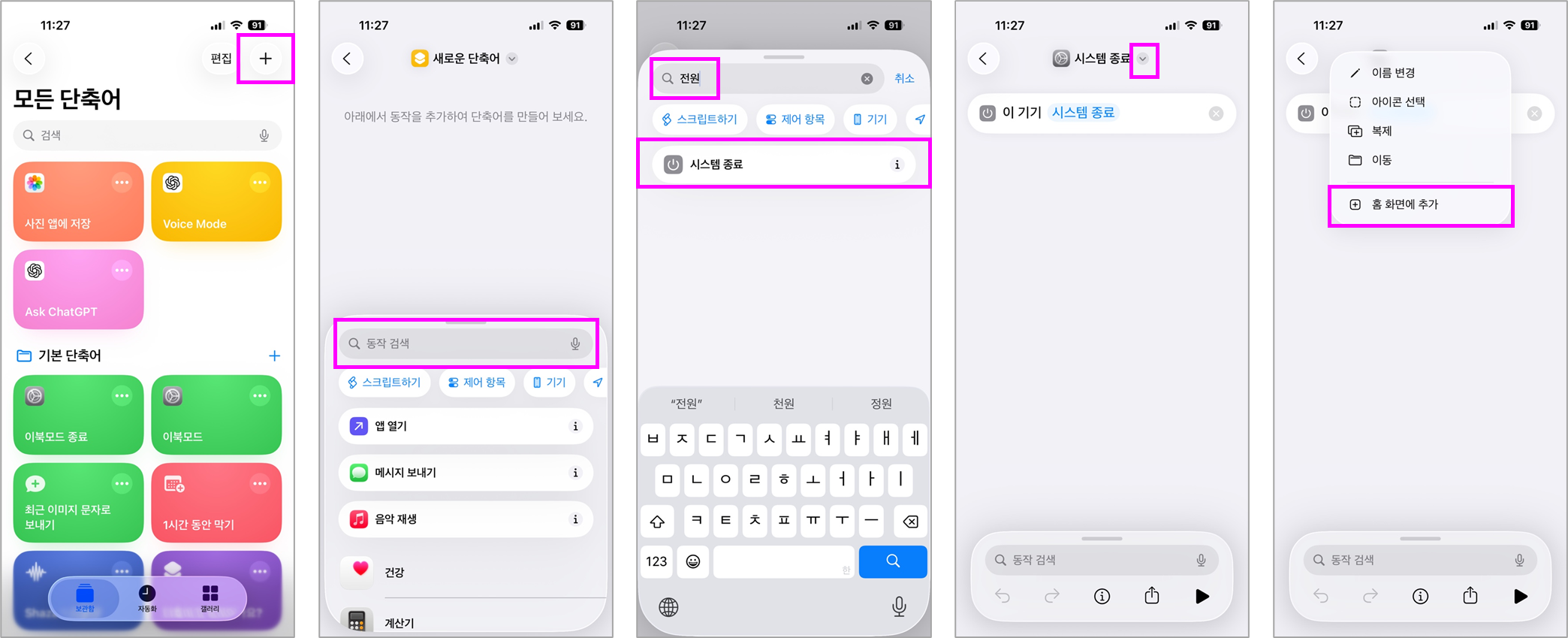 ④ '시스템 종료' 단축어 옆 아래화살표(∨)를 클릭하여 '홈 화면에 추가'해 줍니다.