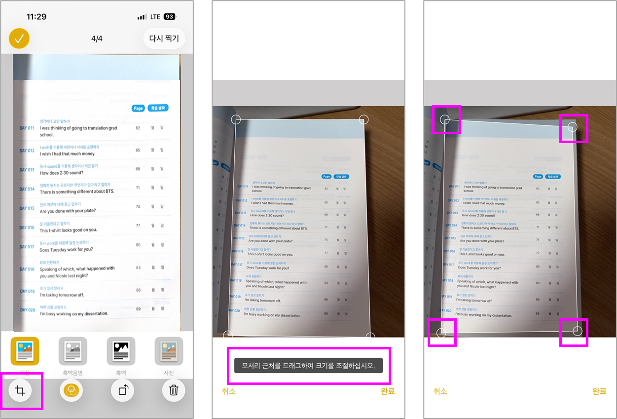 촬영 후에도 모서리를 다시 조정해 원하는 부분만 저장할 수 있습니다.