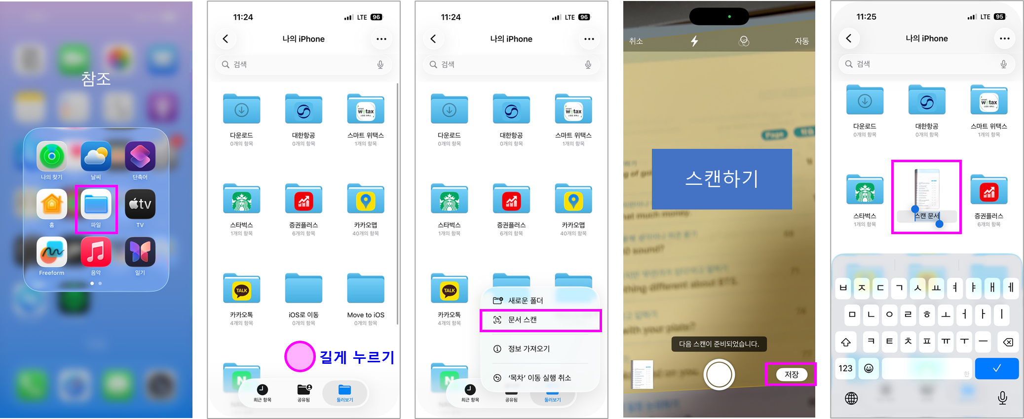 ③ 빈 공간을 꾹 눌러 '문서 스캔' 메뉴를 선택합니다.