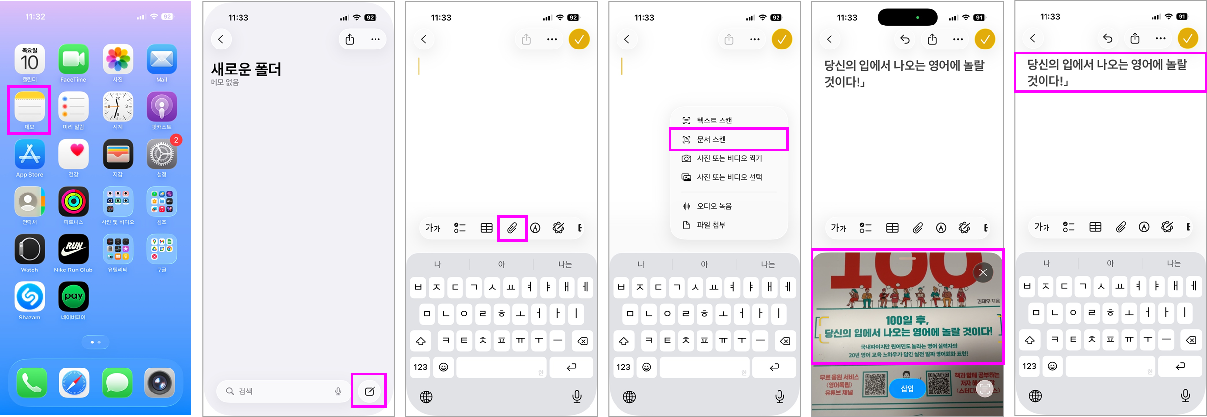 메모 앱에서 텍스트 스캔 기능을 사용하면 사진 속 글씨를 바로 텍스트로 변환해 복사할 수 있습니다.