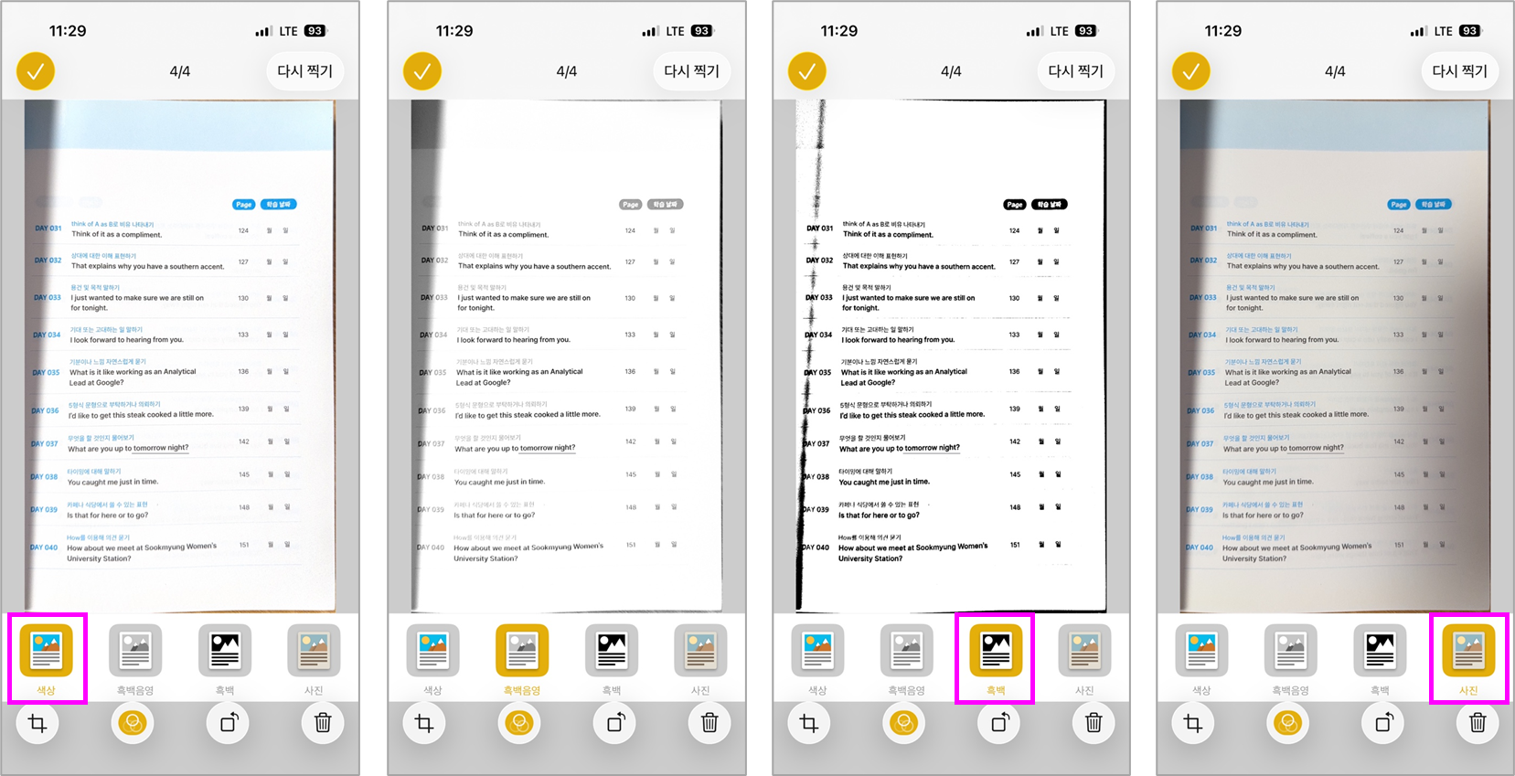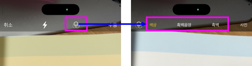 스캔 중 색상 모드를 변경할 수 있어 색상, 흑백음영, 흑백, 사진 필터를 적용해 깔끔하게 정리가 가능합니다.