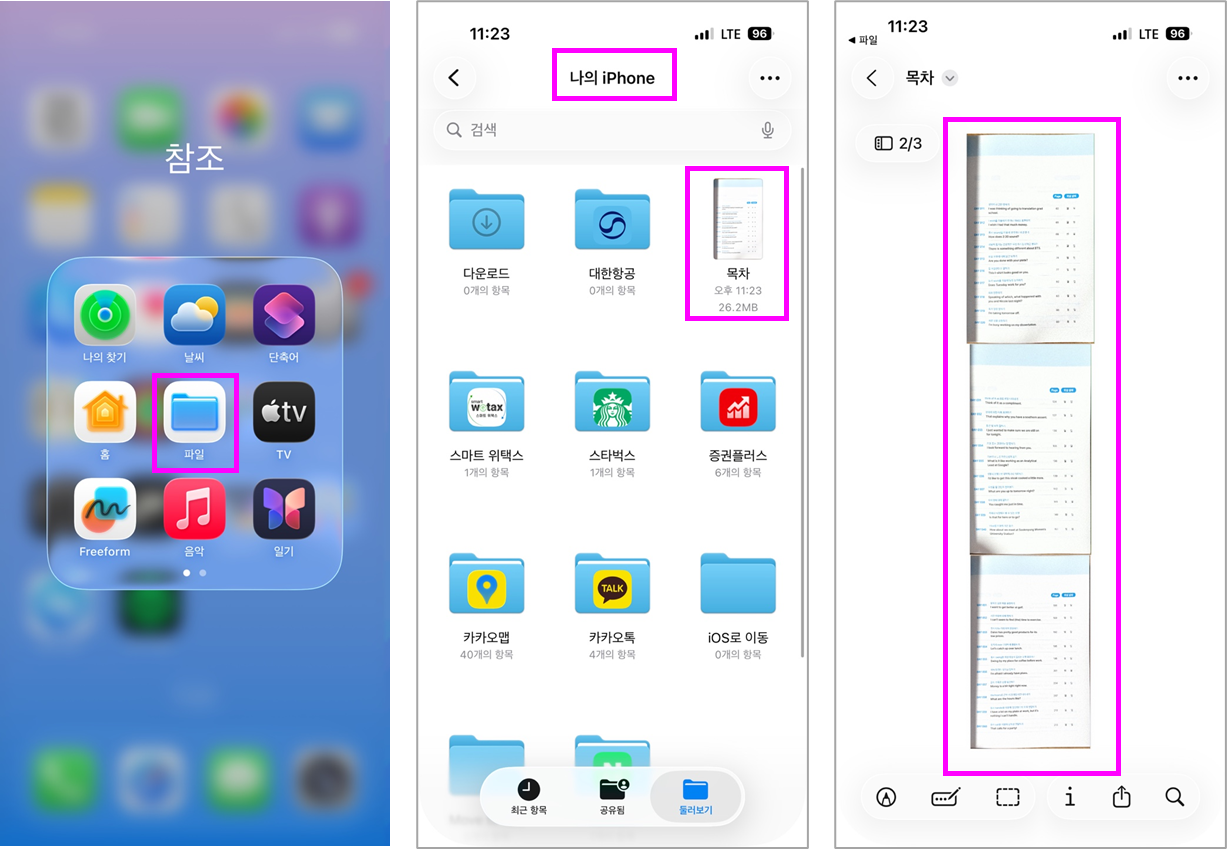 ※ '파일' 앱 → 파일을 저장한 위치로 이동 → 저장한 파일을 선택하면 스캔한 파일 내용을 확인할 수 있습니다.