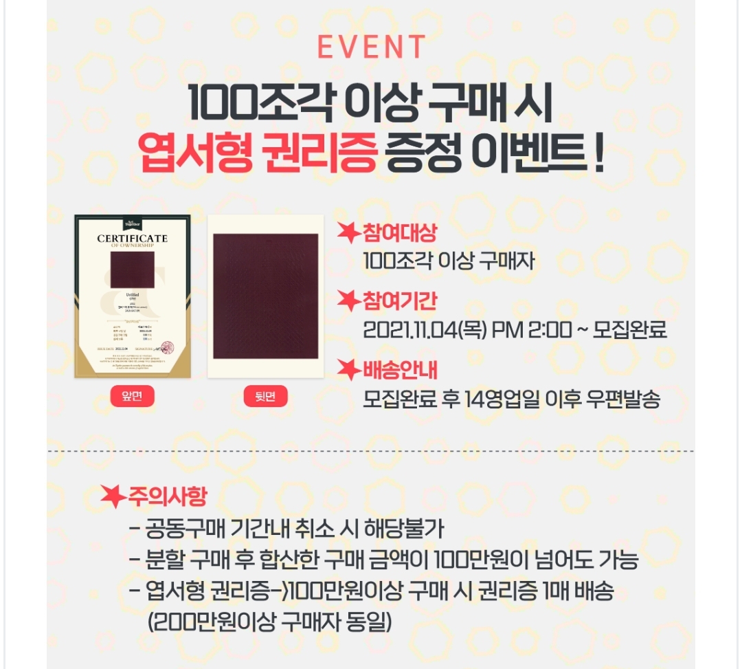 김기린 화백 그림공동구매 이벤트는 1) 구매후기 이벤트 2) 100조각 이상 구매시 엽서형 권리증 증정 이벤트 두가지입니다.