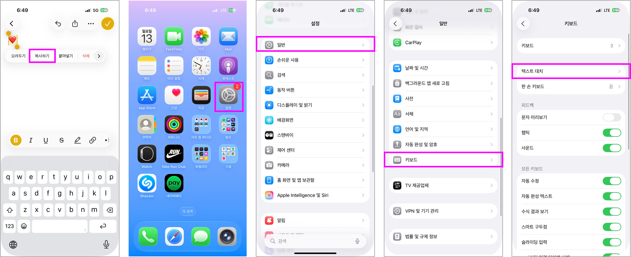 ② "설정 앱 → 일반 → 키보드 → 텍스트 대치"로 이동합니다.