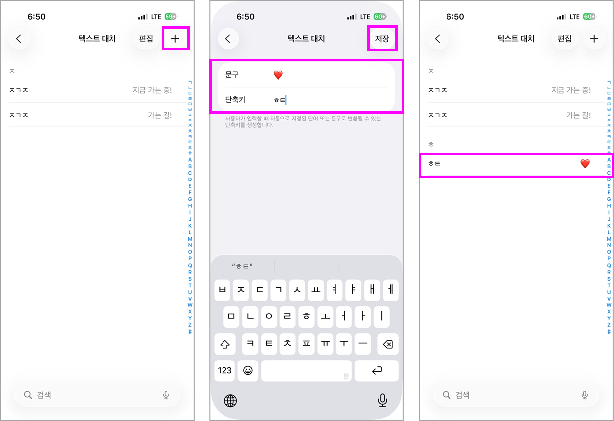 ④ 문구에 복사한 하트(예: ♡) 붙여넣고 단축키에 원하는 단어(예: ht, love 등) 입력하고 저장을 눌러 완료합니다.