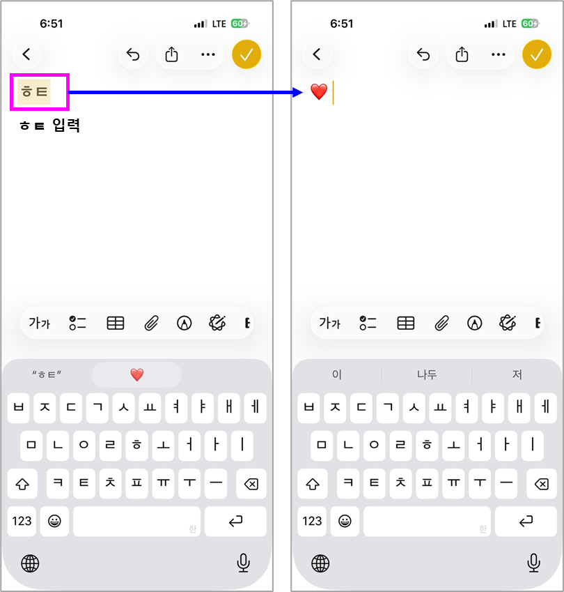 이제 메모, 카카오톡, 인스타그램 등 어디서든 "ㅎㅌ"를 입력하면 하트가 자동으로 완성됩니다.