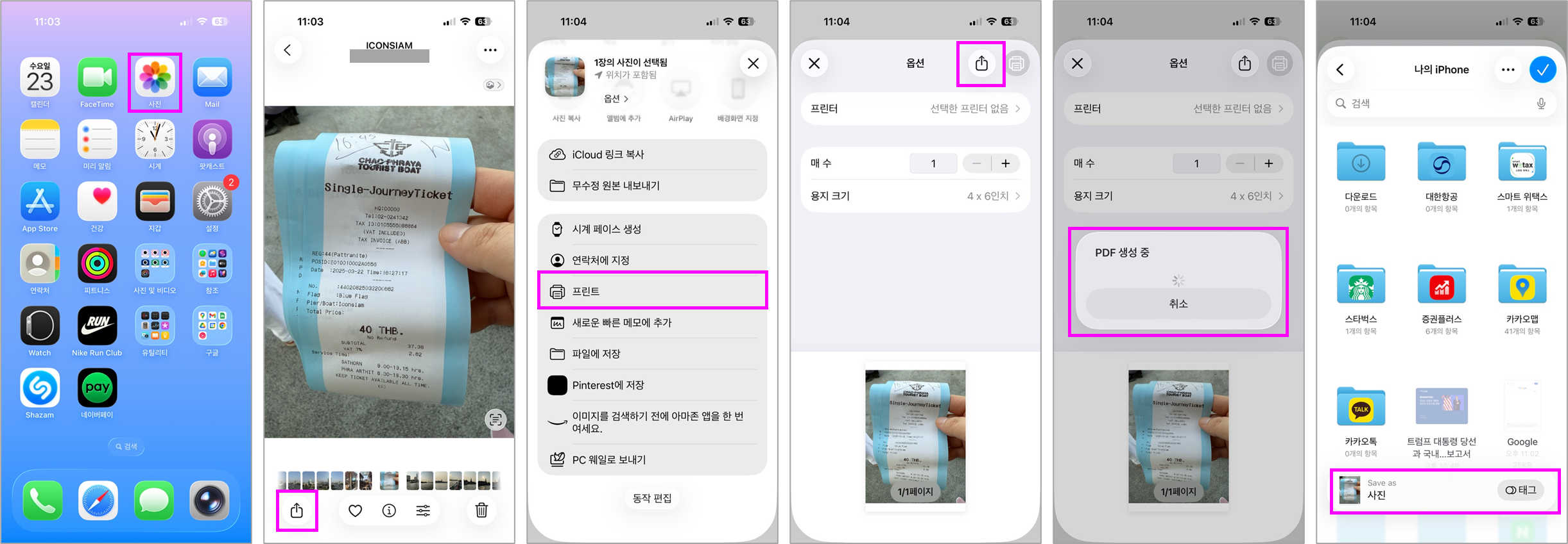 ① 사진 앱 → 사진 선택 → 공유 → 프린트 > 공유 버튼 > 파일 앱에 저장하는 순서로 사진을 PDF로 저장할 수 있습니다.