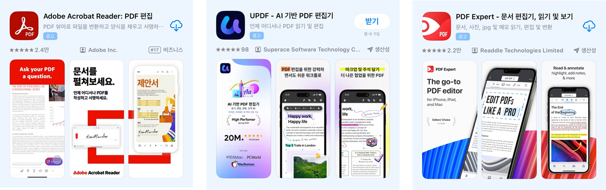 - UPDF, PDF Expert 등: 주석, 텍스트 검색, AI 요약 등 특화된 기능을 활용할 수 있습니다.