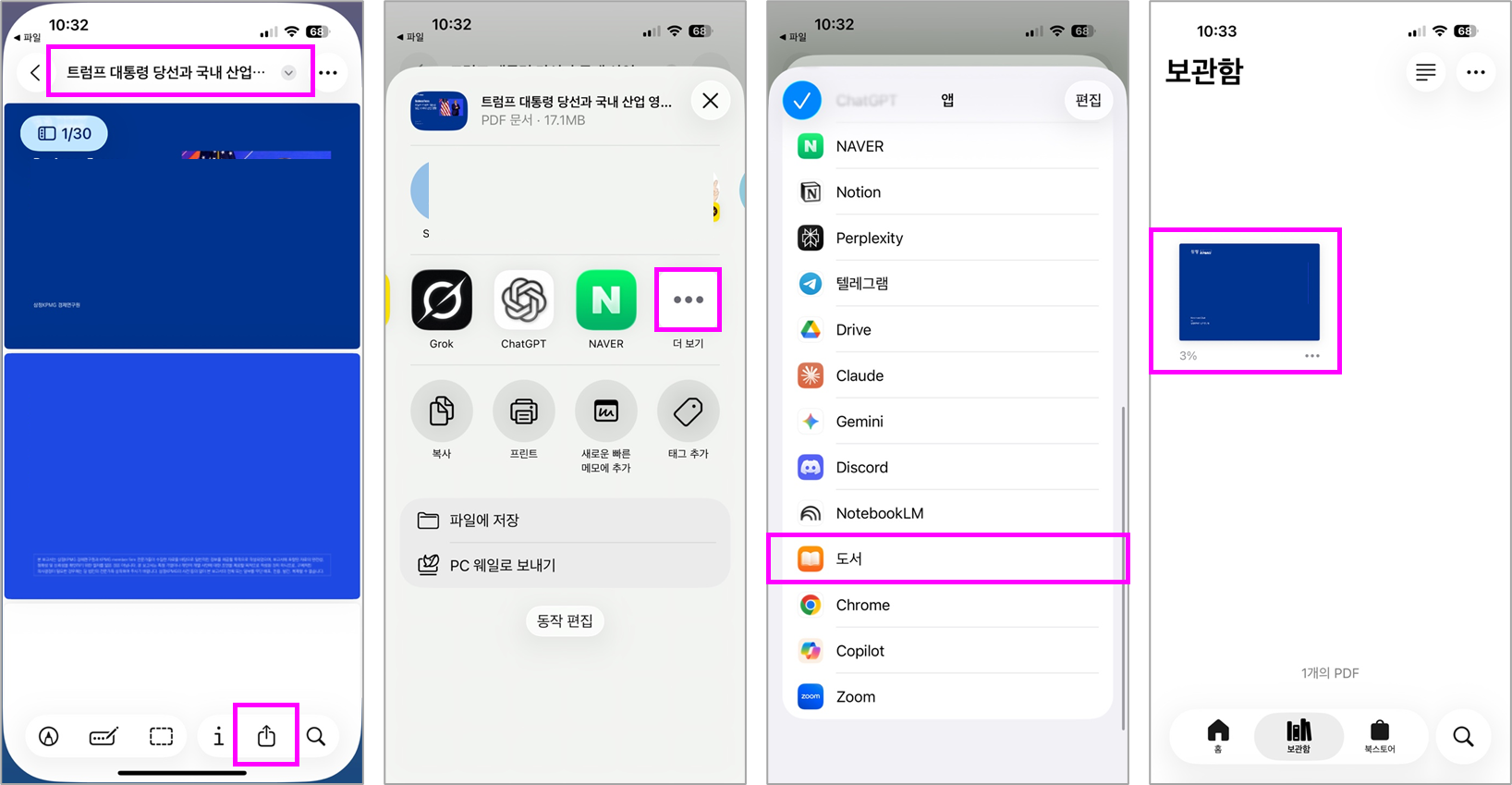 "공유 아이콘 → 앱 부분을 스크롤 → 더 보기 → 도서"를 선택한 후 도서 앱에서 해당 PDF를 확인할 수 있습니다.