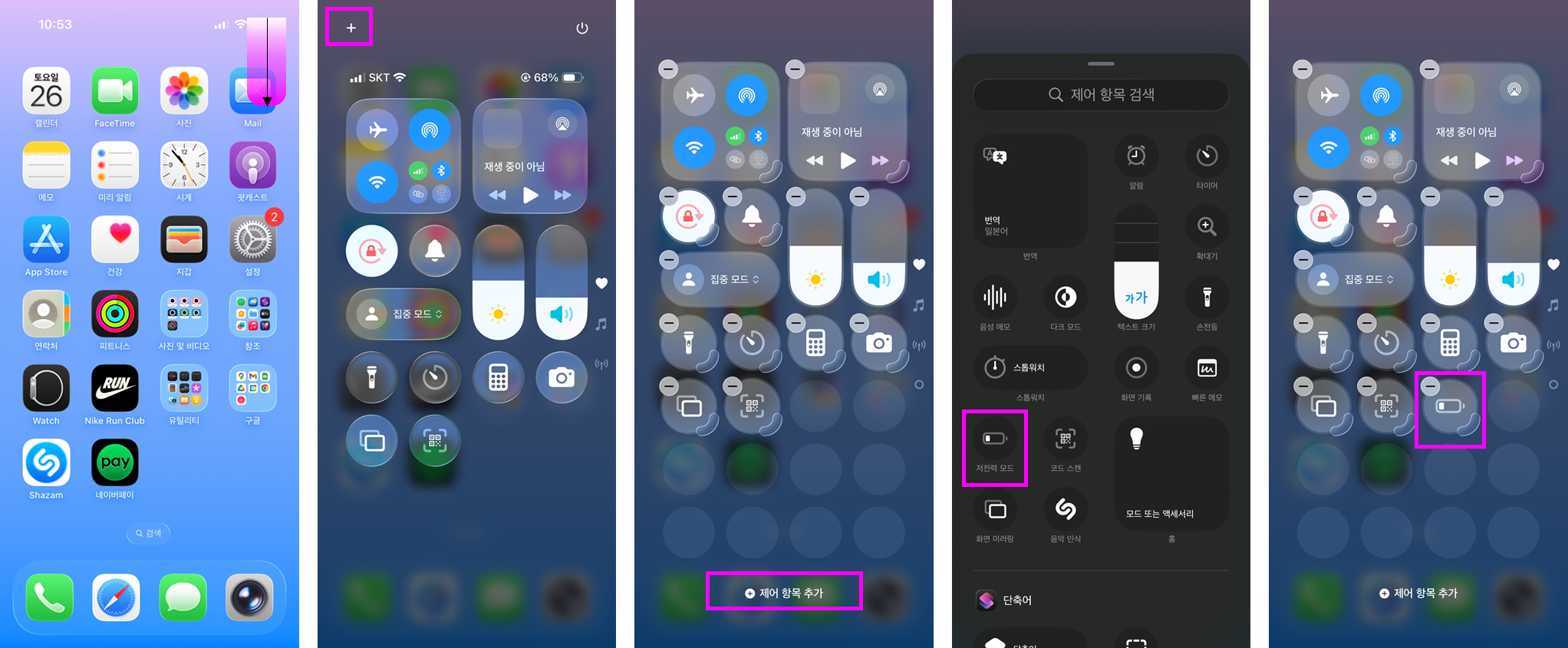 제어 센터에서 저전력 모드(배터리 아이콘)를 켜면 AOD가 비활성화되어 배터리 소모를 확 줄일 수 있습니다.