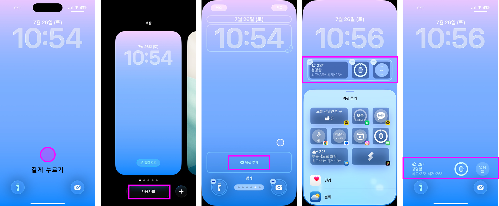 ② 시간 아래 빈 공간에 날씨, 캘린더, 배터리 상태 등 원하는 위젯을 할 수 있습니다.