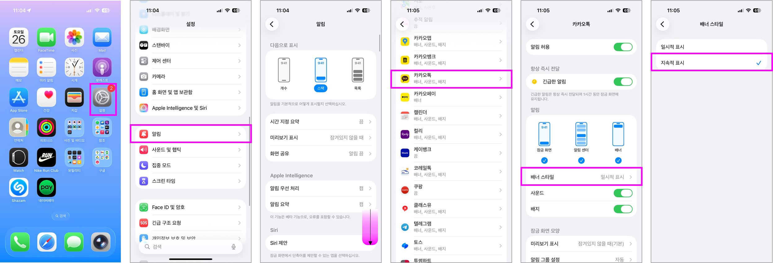 "설정 앱 → 알림 → 앱 선택 → 배너 스타일"에서 중요한 앱(예: 카카오톡, 메시지)의 알림을 '지속적 표시'으로 설정합니다.