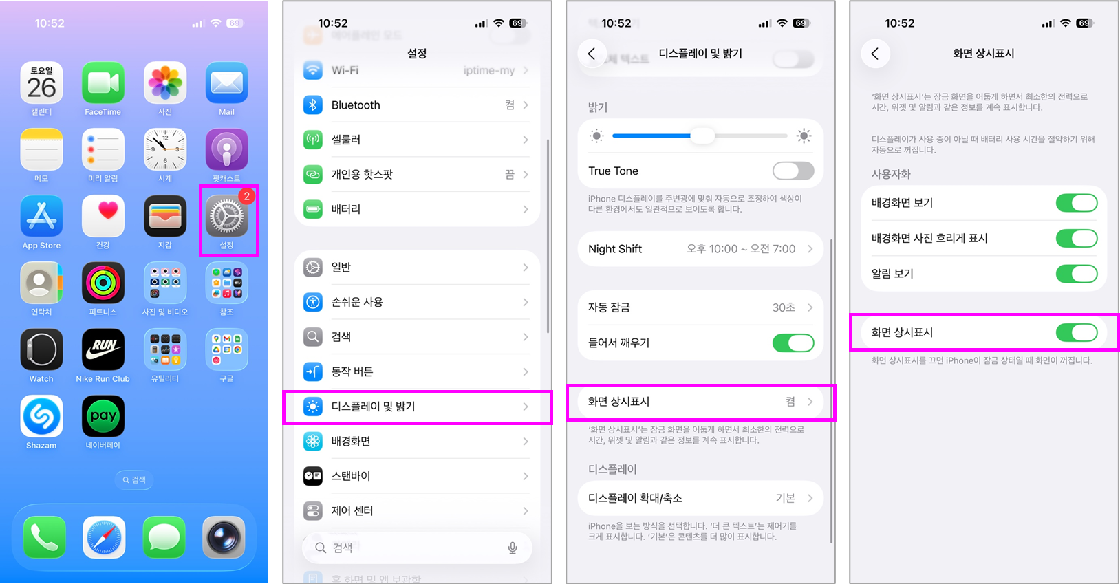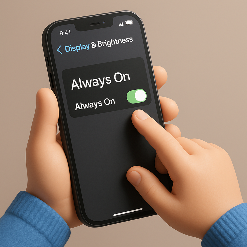 ① "설정 앱 → 디스플레이 및 밝기 → 화면 상시표시"로 이동합니다.