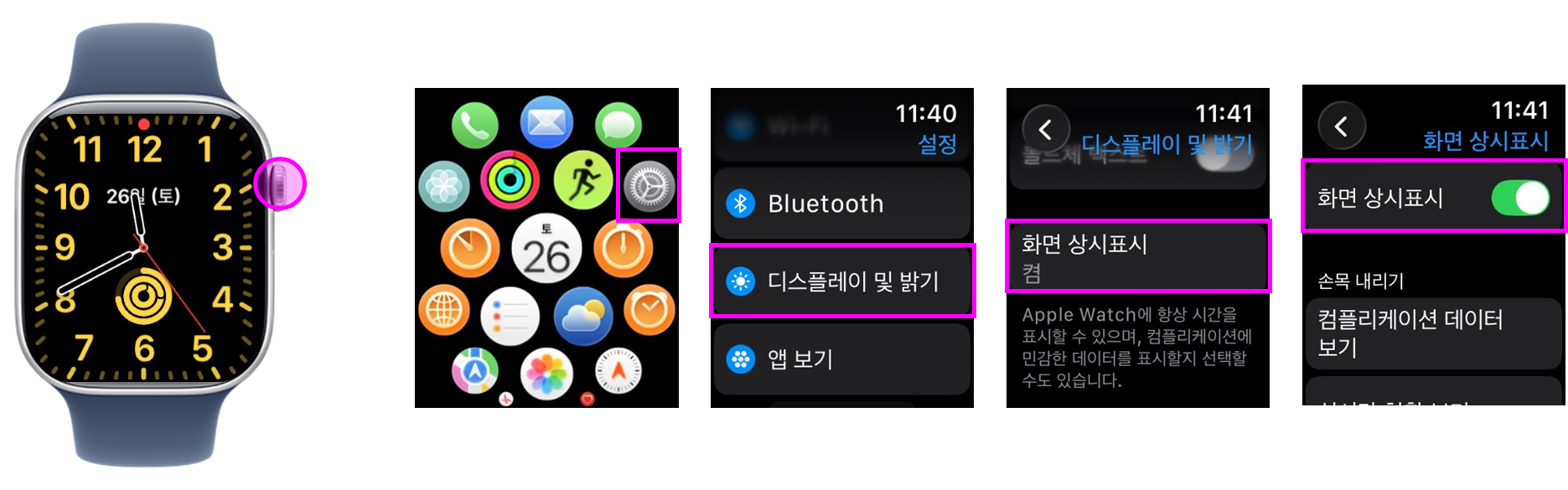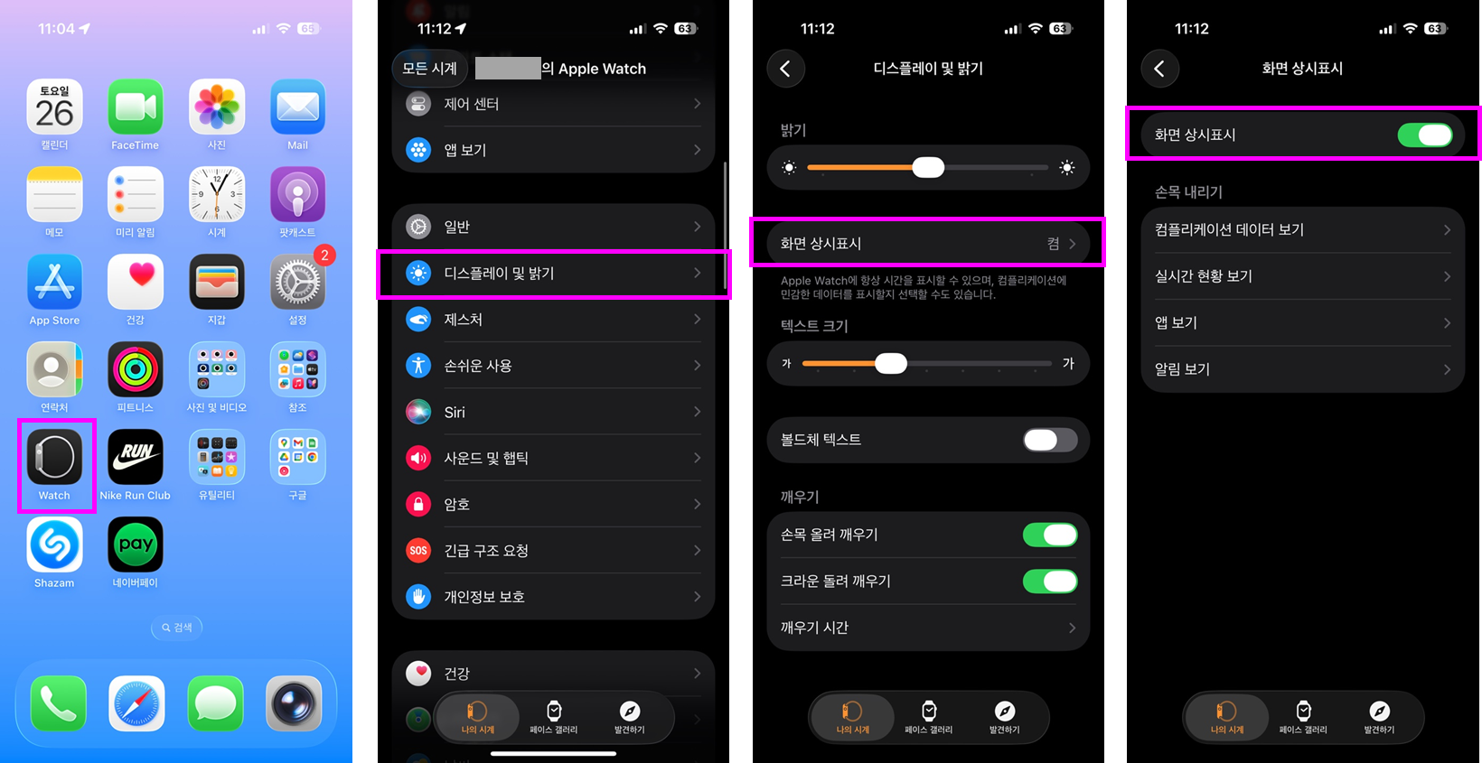 ① 애플 워치에서 "설정 → 디스플레이 및 밝기 → 화면 상시표시 → 화면 상시표시"를 활성화 합니다.