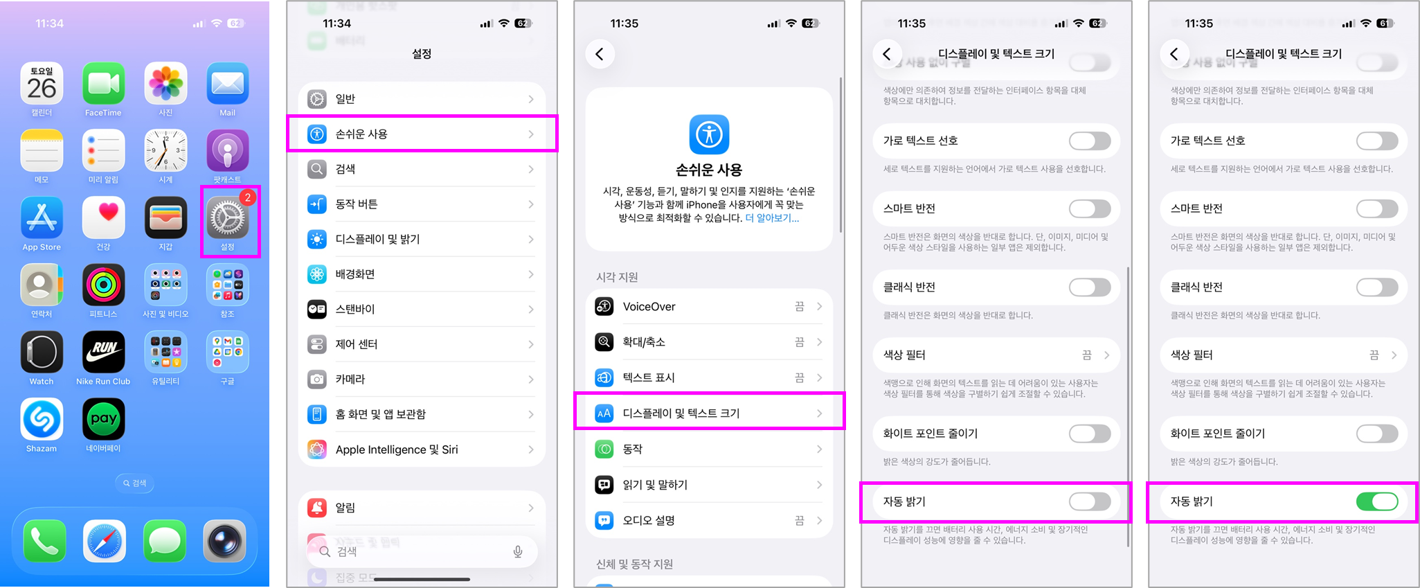 ① "설정 앱 → 손쉬운 사용 → 디스플레이 및 텍스트 크기 → 자동 밝기" 를 켜둡니다.