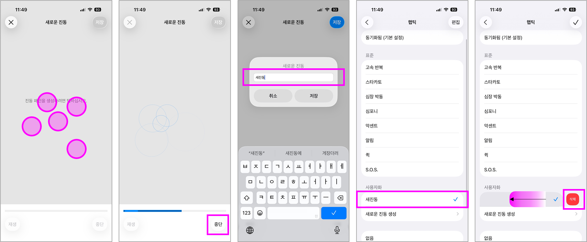 ② '사용자화된 진동'을 선택하고 화면을 탭해 원하는 패턴을 만드세요. (예: 짧게 두 번, 길게 한 번)