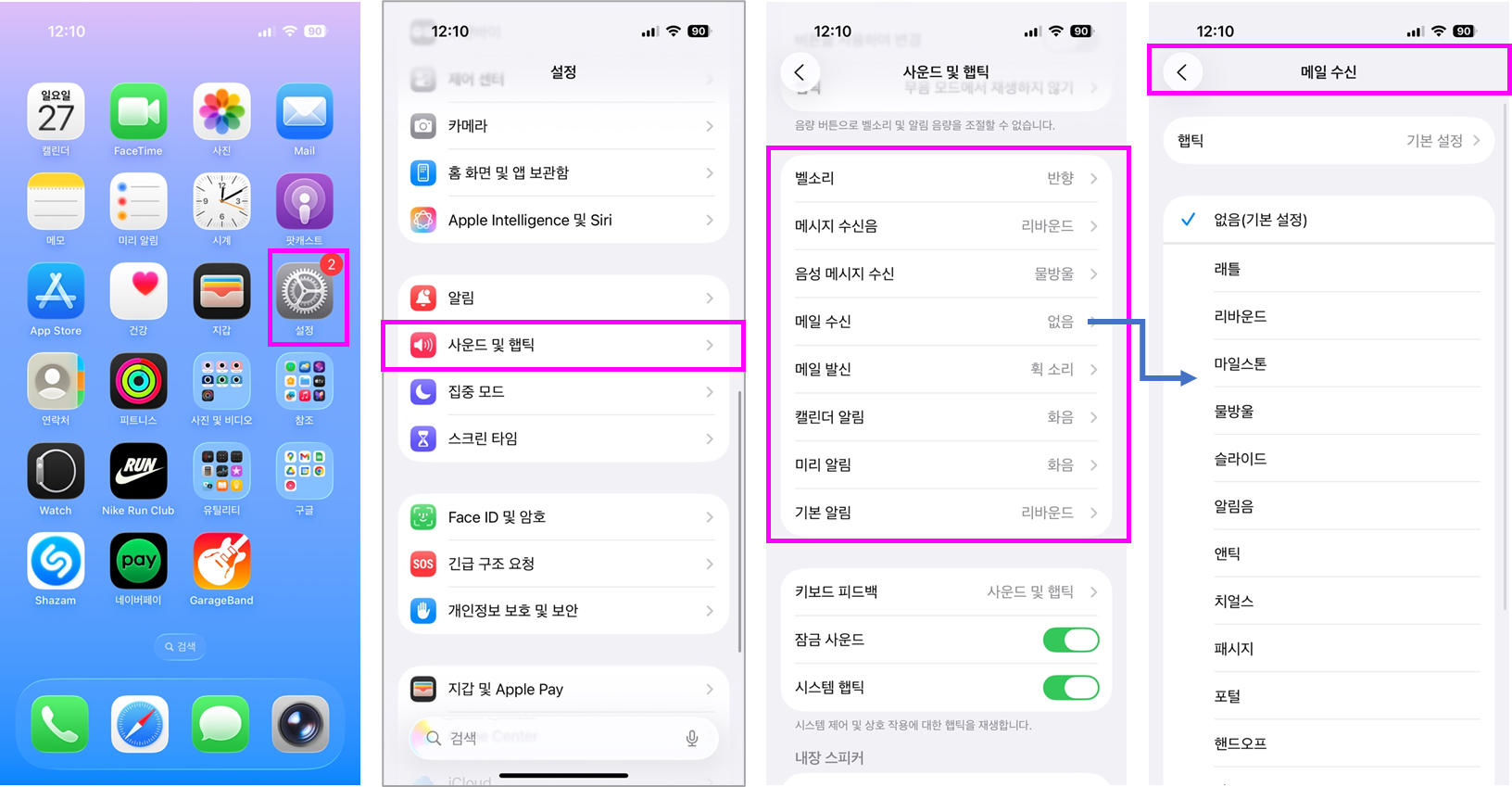 설정 → 사운드 및 햅틱 → '문자 메시지', '새로운 이메일' 등의 항목을 선택하여 소리를 변경합니다.