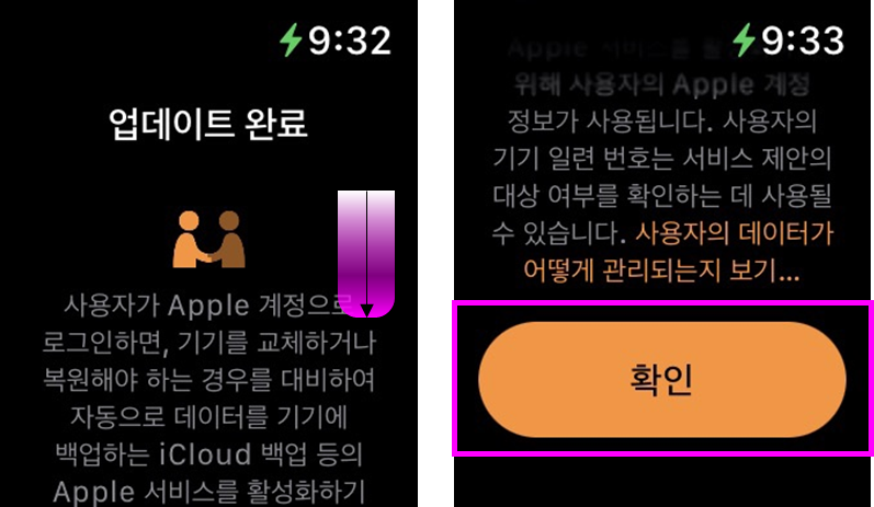 애플워치에서도 업데이트 완료 메시지를 확인할 수 있고 '확인' 버튼을 누르면 새로운 소프트웨어를 사용할 수 있습니다.
