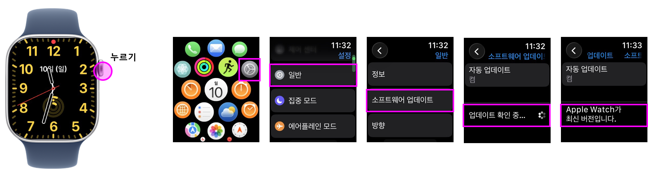 최신 watchOS로 업그레이드하면 더 나은 성능과 새로운 기능을 사용할 수 있으니 항상 최신 소프트웨어를 유지하는 것을 추천 드립니다.