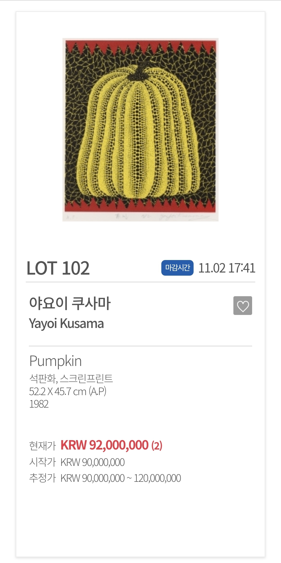 | 아트앤가이드, 쿠사마 야요이 'Pumpkin' 그림공동구매 아트테크 (0) | 2021.11.21 |