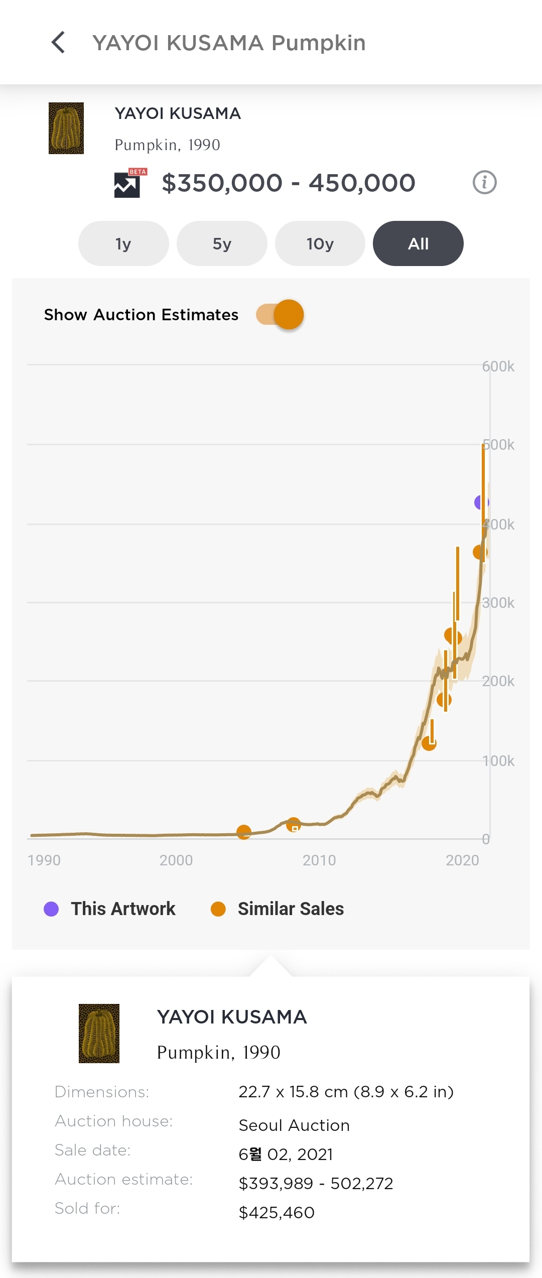 그리고 같은 해에 제작된 또다른 Pumpkin 작품의 경우 가격 상승이 드라마틱하다는 것을 알 수 있습니다.