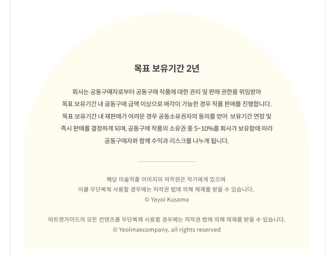 쿠사마 야요이님의 작품은 몇번이나 공동구매에 참여하기도 했고 최소 투자 가능 금액이 100만원이라 조금 고민이 되긴 합니다.