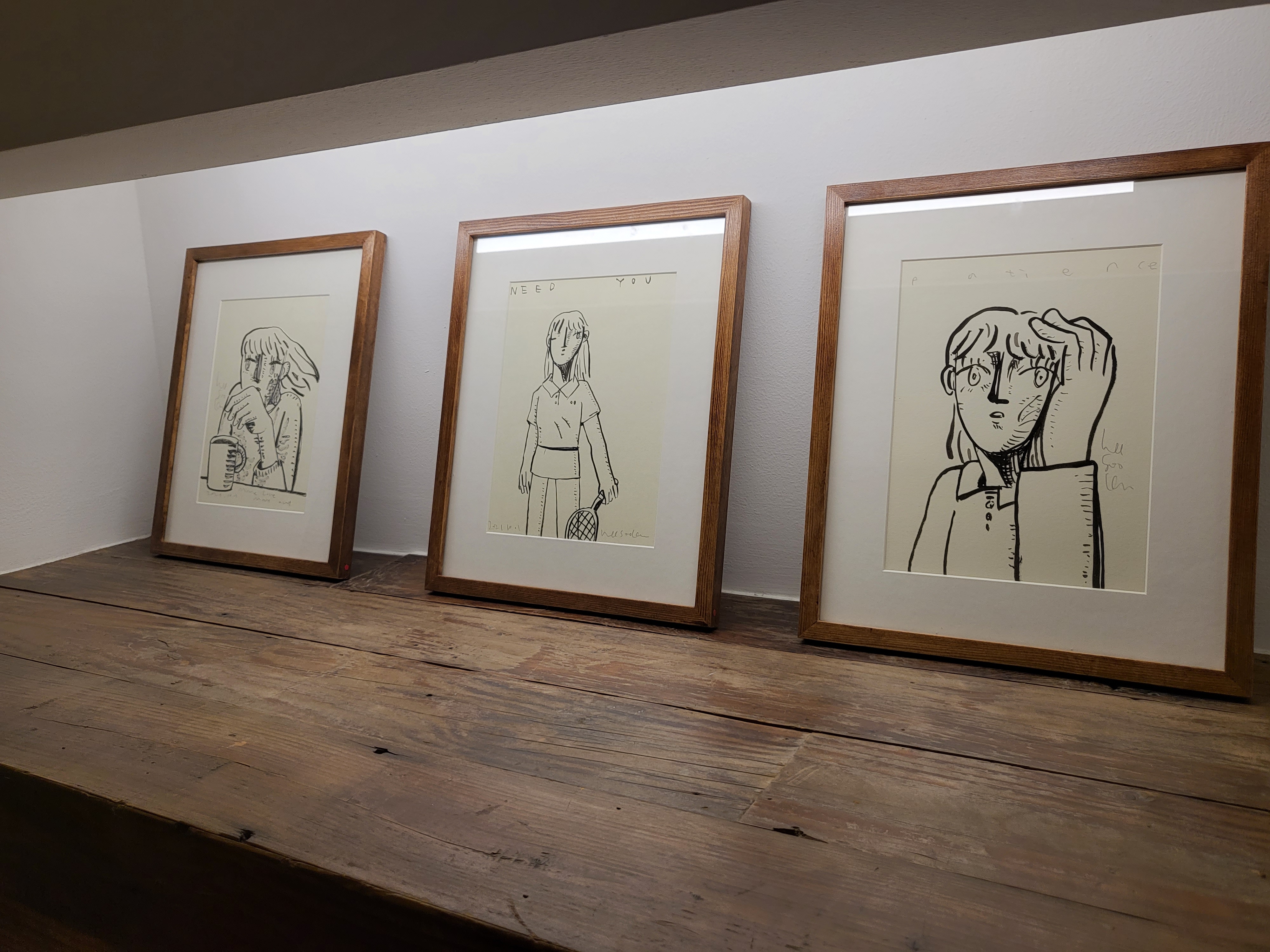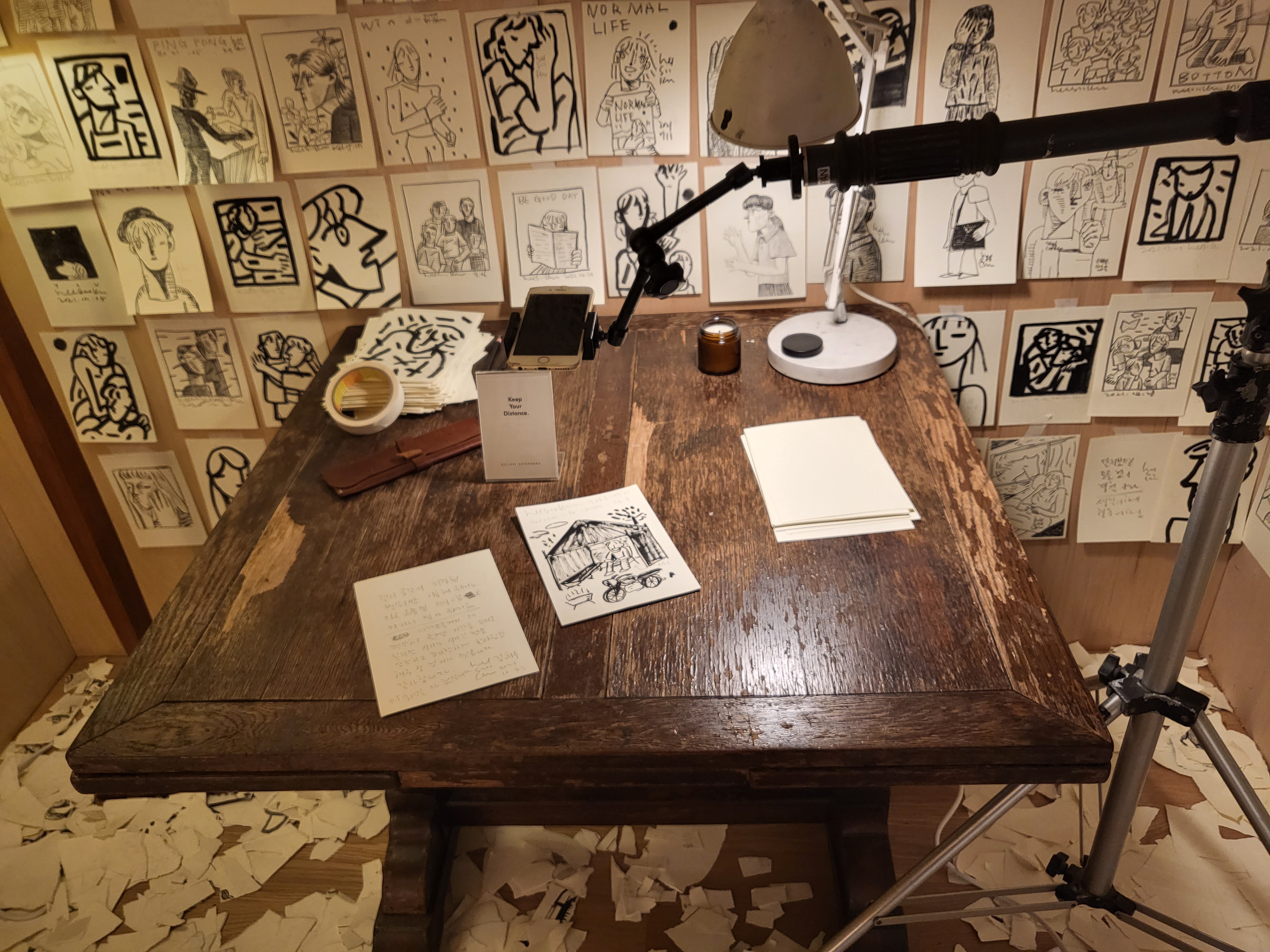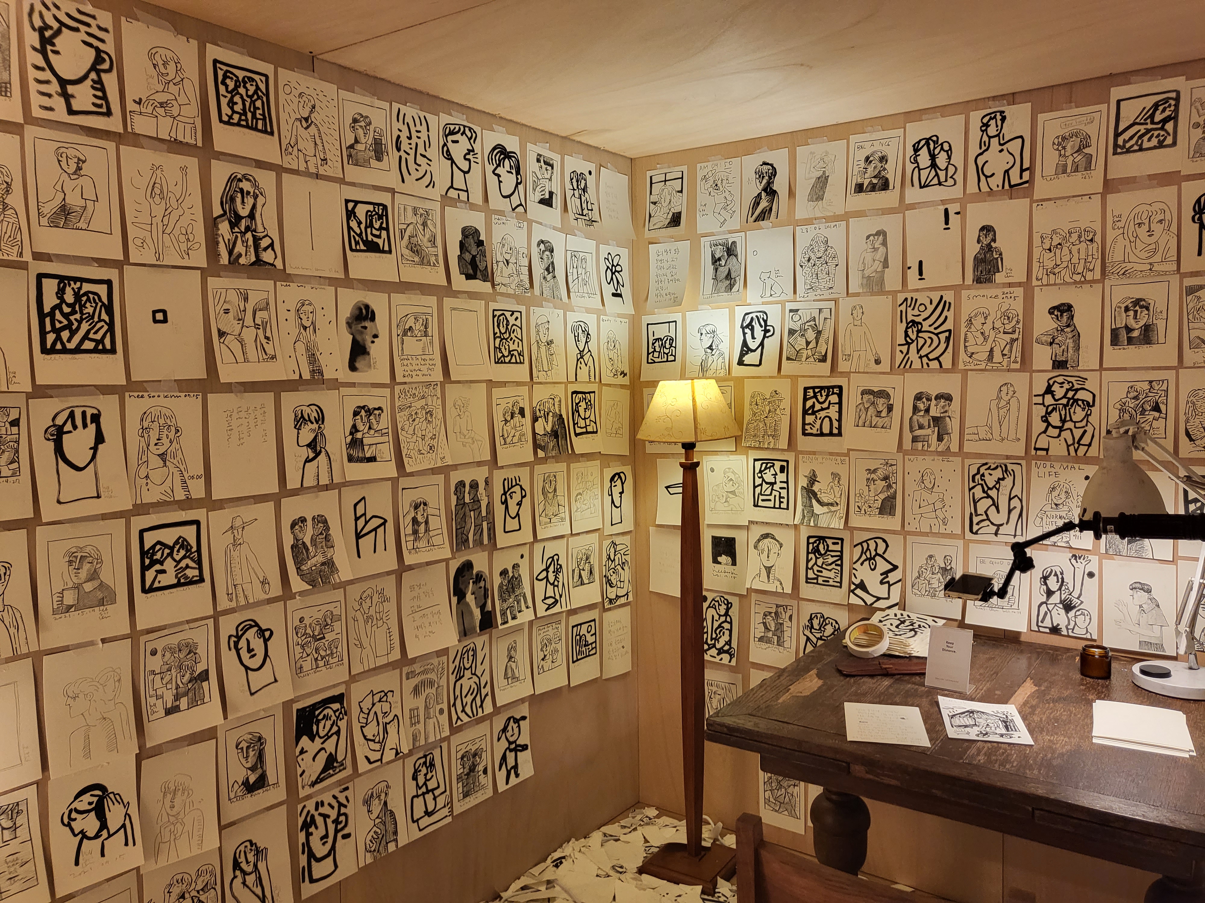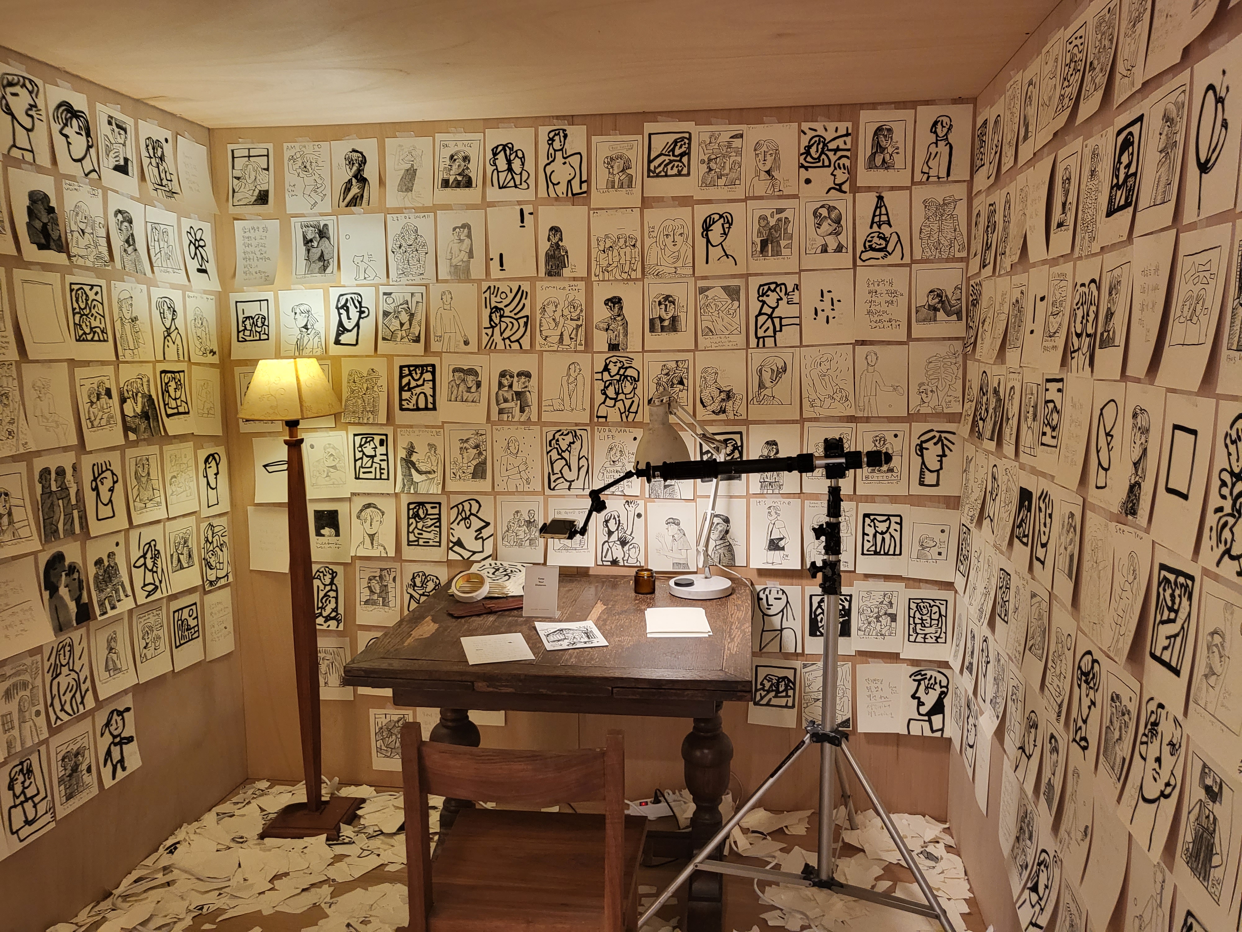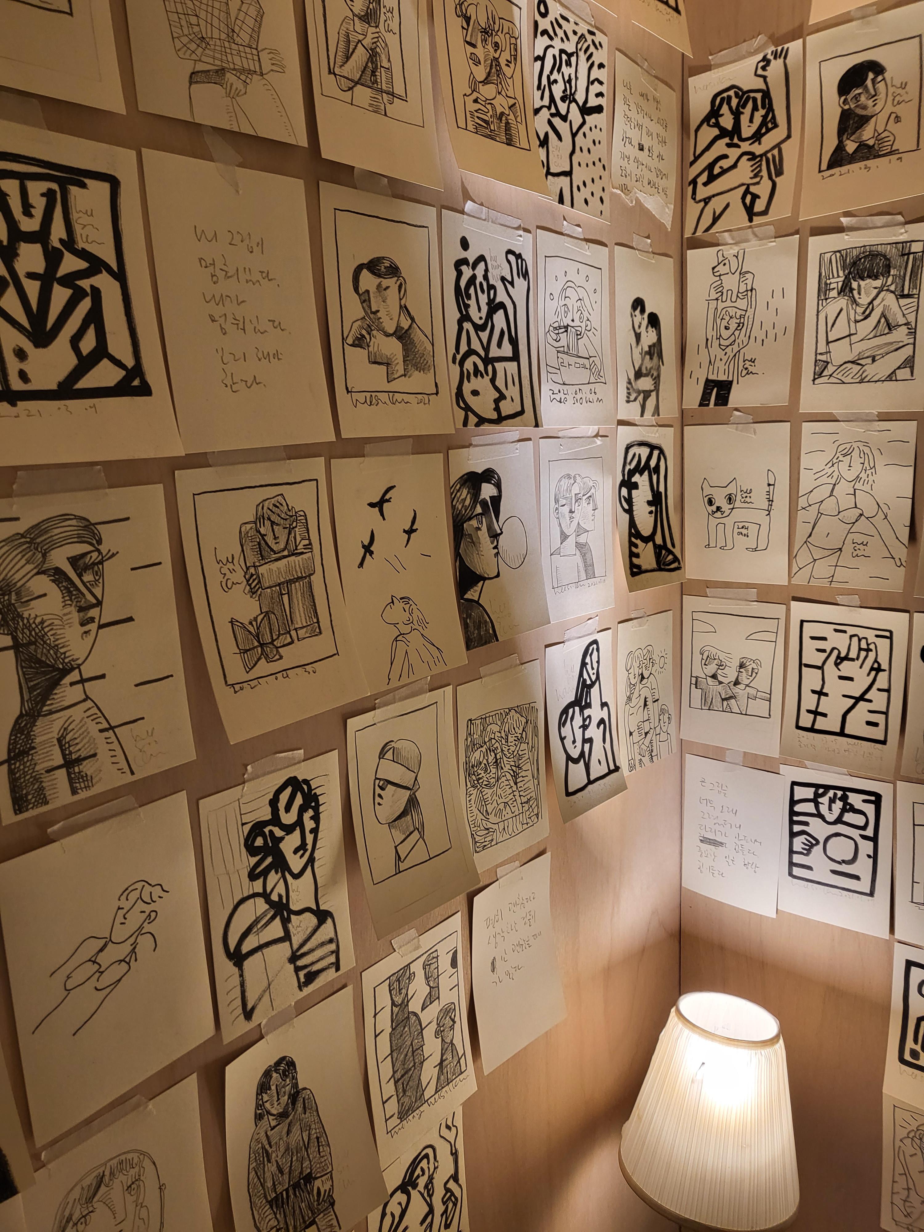 전시장 3층에 마련된 드로잉 룸 역시 작가가 직접 기획하고 제작했습니다. 이 안에는 늦은 밤 외딴 작업실에서 SNS를 통해 관객들과 소통하며 진행해왔던 라이브 드로잉 작품들이 포함되어 있습니다. 캔버스 작품의 밑그림이 되는 수백장의 드로잉들을 통해 작가가 자신만의 회화적 이미지를 구축해가는 과정을 만나볼 수 있습니다.
