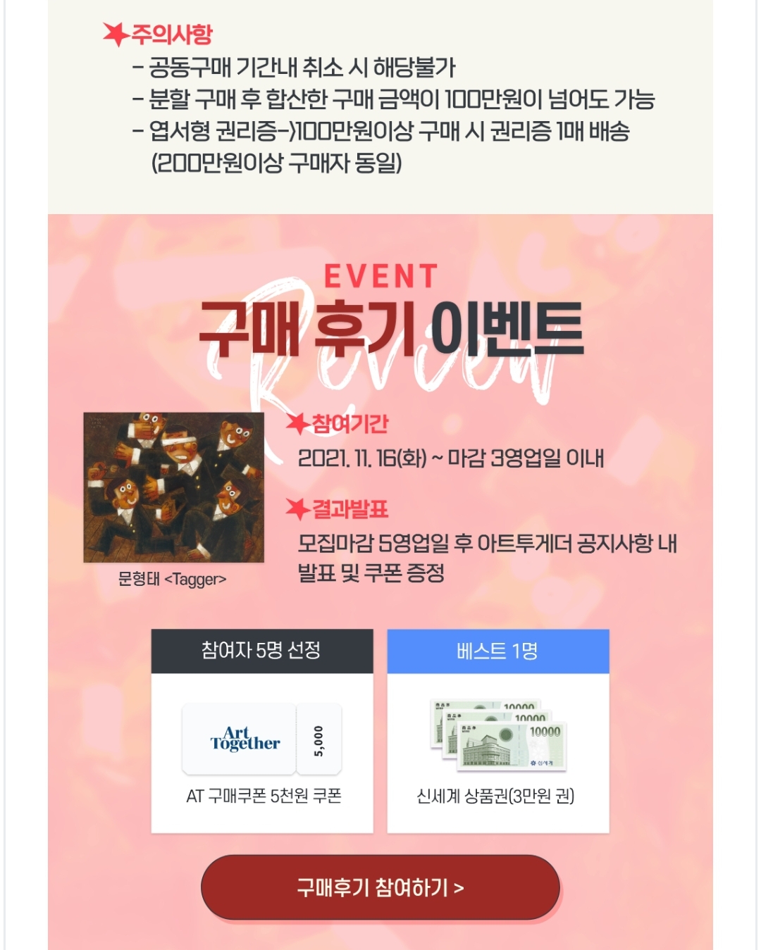 아트투게더에서는 1) 100조각 이상 구매시 엽서형 권리증 증정 이벤트와 2) 구매 후기 이벤트를 진행하고 있습니다.