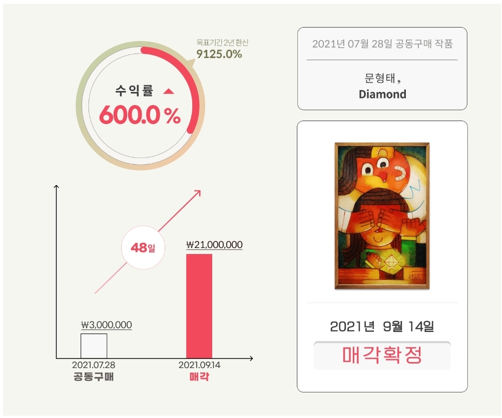 아래 두 작품 'Bark', 'Diamond'의 경우 아트앤가이드에서 공동구매했었고 제가 참여했던 문형태 작가님의 작품으로 각각 188%, 600%의 수익률을 보여줬습니다.