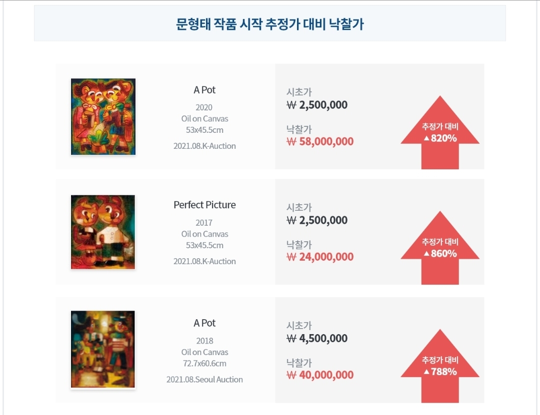 'A Pot' 작품은 시초가 250만원에서 시작해서 5,800만원에 최종 낙찰되어 추정가 대비 820% 높은 가격에 거래되었고, 다른 작품들도 비슷한 경우가 많았네요.