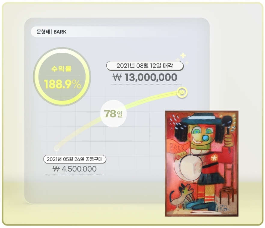 제가 좋아하는 작가님일뿐 아니라, 이 곳은 아니지만 다른 아트테크 플랫폼에서 참여했던 작품이 짧은 기간 내에 두번 팔렸고 두 번 모두 큰 수익을 안겨줘서 소액투자 했던것이 아쉬울 정도였습니다.