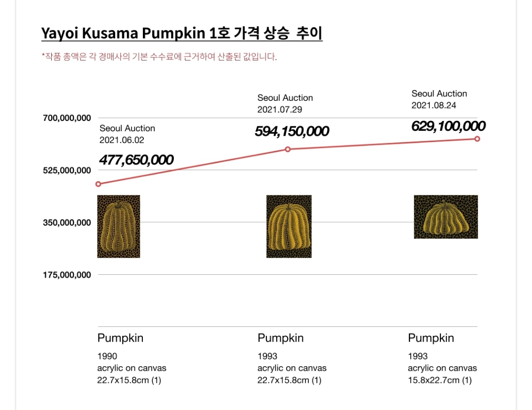 ① Pumpkin 1호 가격의 상승 추이, ② Yayoi Kusama 작품 가격의 상승 추이, ③ 글로벌 경매 시장에서의 90% 이상의 높은 낙찰률, ④ Yayoi Kusama 작품의 매물잠금과 콜렉터들의 높은 수요