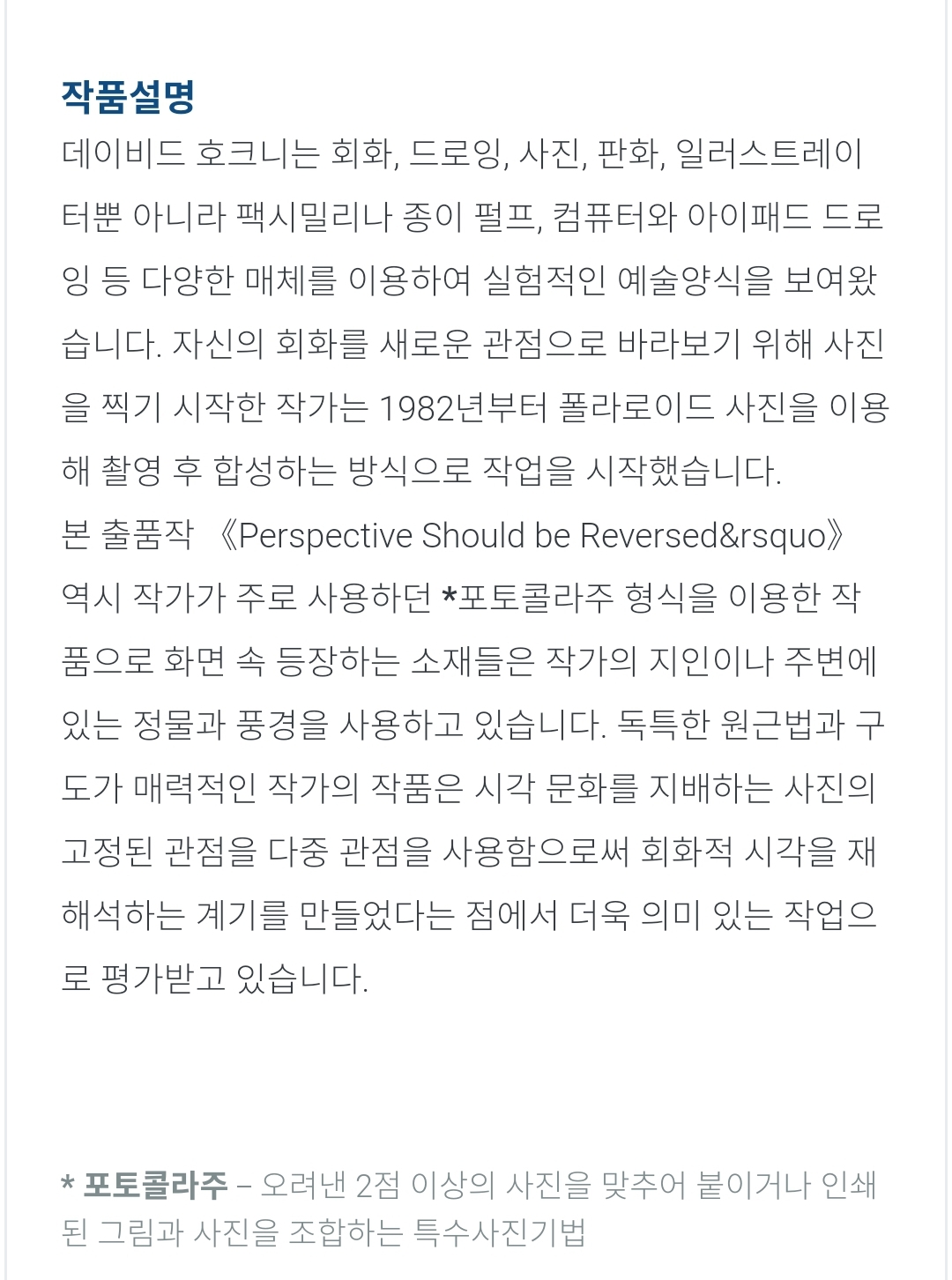 호크니 자신의 회화를 새로운 관점으로 바라보기 위해 1982년부터 폴라로이드로 사진을 촬영해 합성하는 방식으로 작업했다고 하는데, 이 작품은 포토콜라주(2점 이상의 사진을 붙이거나 조합하는 특수 사진 기법) 형식을 이용해서 인물과 정물/풍경으로 사용하고 있습니다.