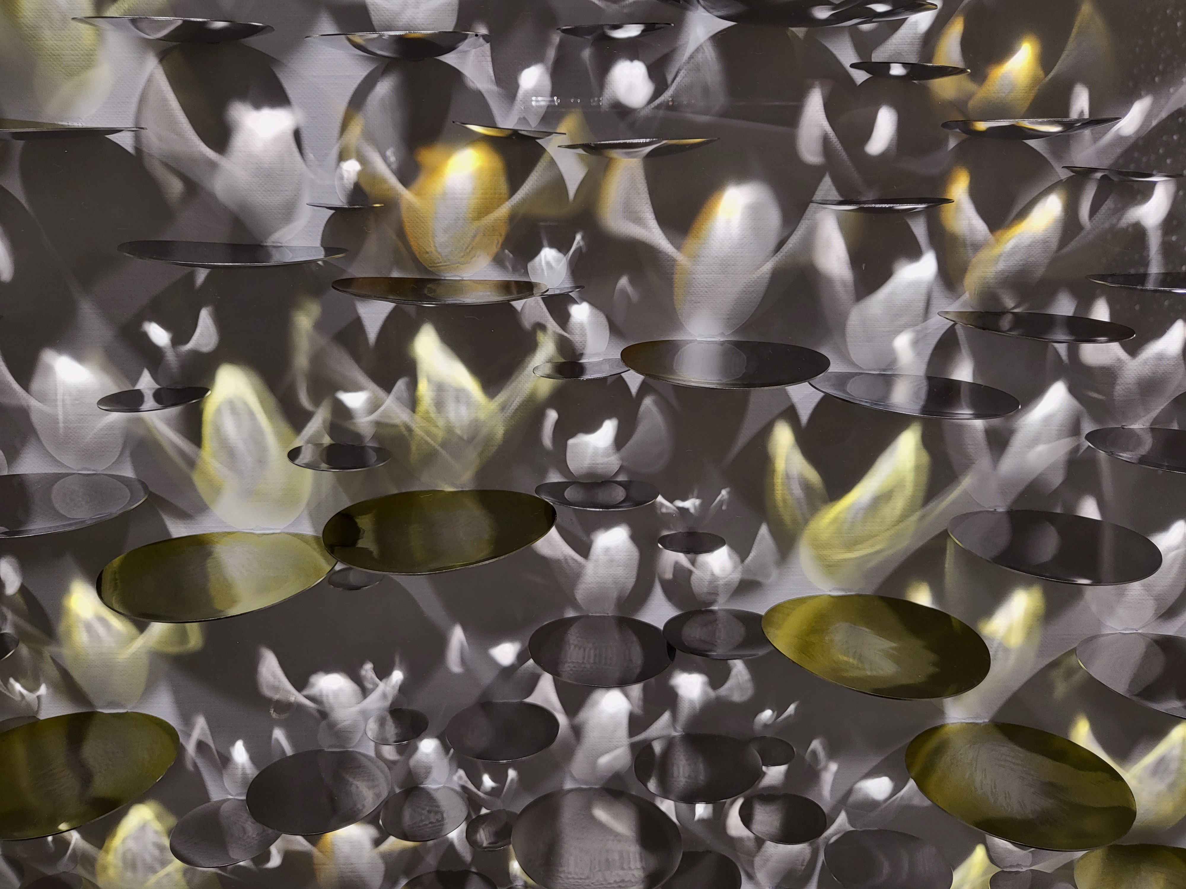 작가 권용래는 자신의 경험을 예술로 승화시키는 작업을 한다. <내면과 외면 ‘사이’의 직관적 표현에 관한 연구 (1992)>를 시작으로 스테인리스 스틸 조각을 활용한 회화와 부조를 융합한 작업을 2004년부터 이어오고 있다. 그의 대표작 <Eternal Flame> 시리즈는 그간의 과정을 보여주기에 충분하다. 작가는 어둑한 작업실의 구석에 쬐 던 광선이 사물을 비추는 순간, 17세기 빛의 화가 렘브란트를 떠올린 후 캔버스 화면 위를 빛으로 물들이고 있 다.