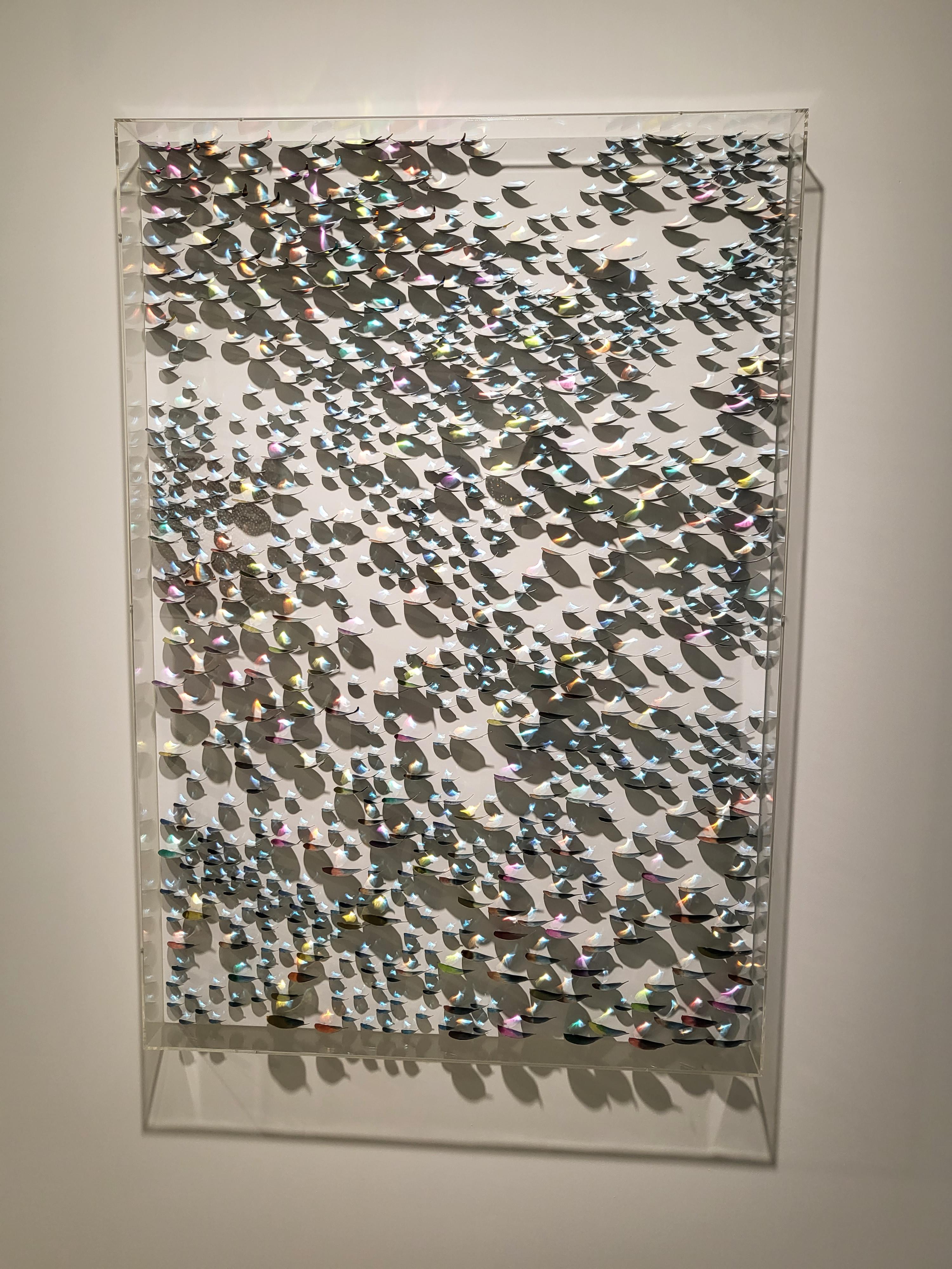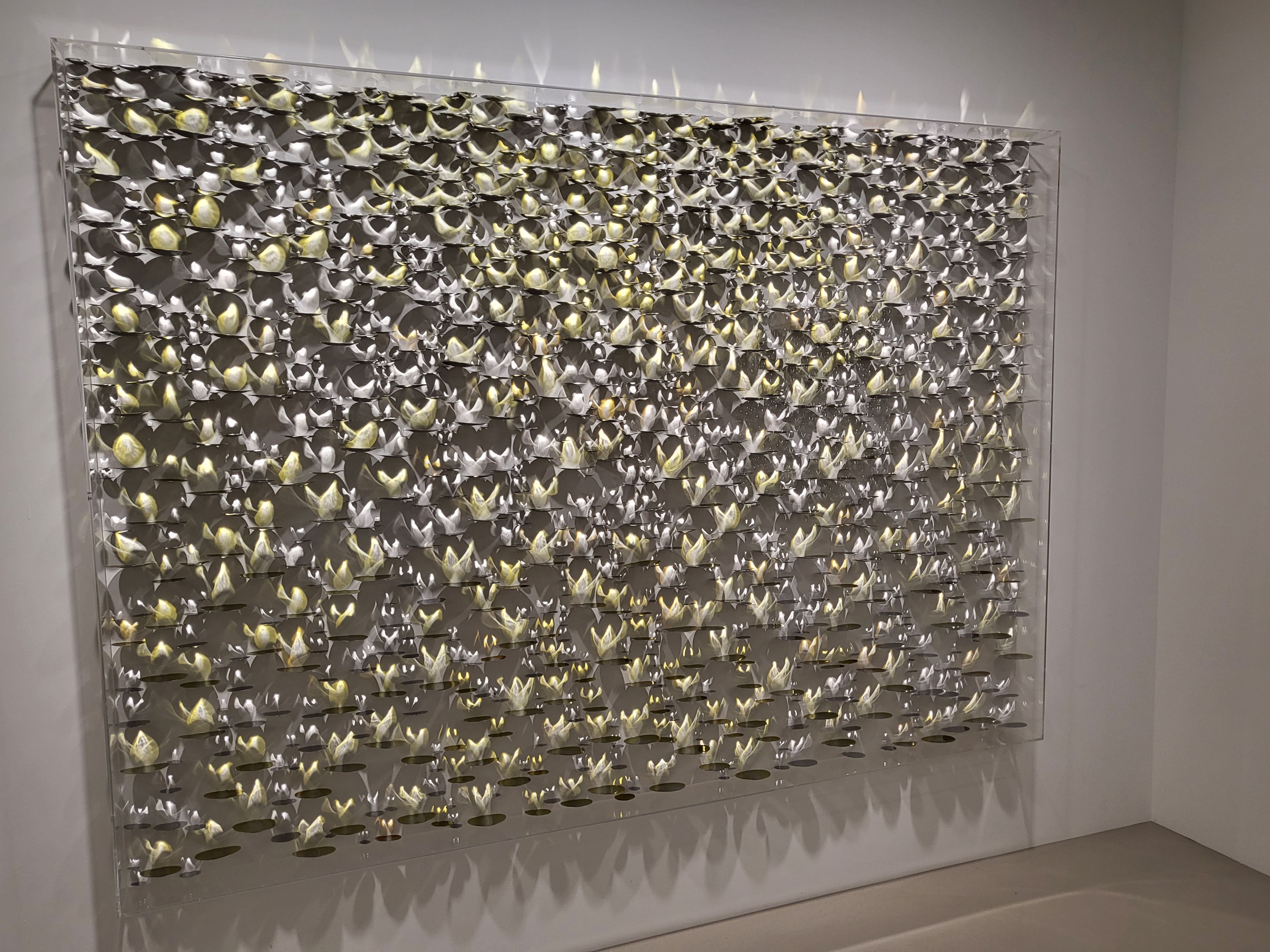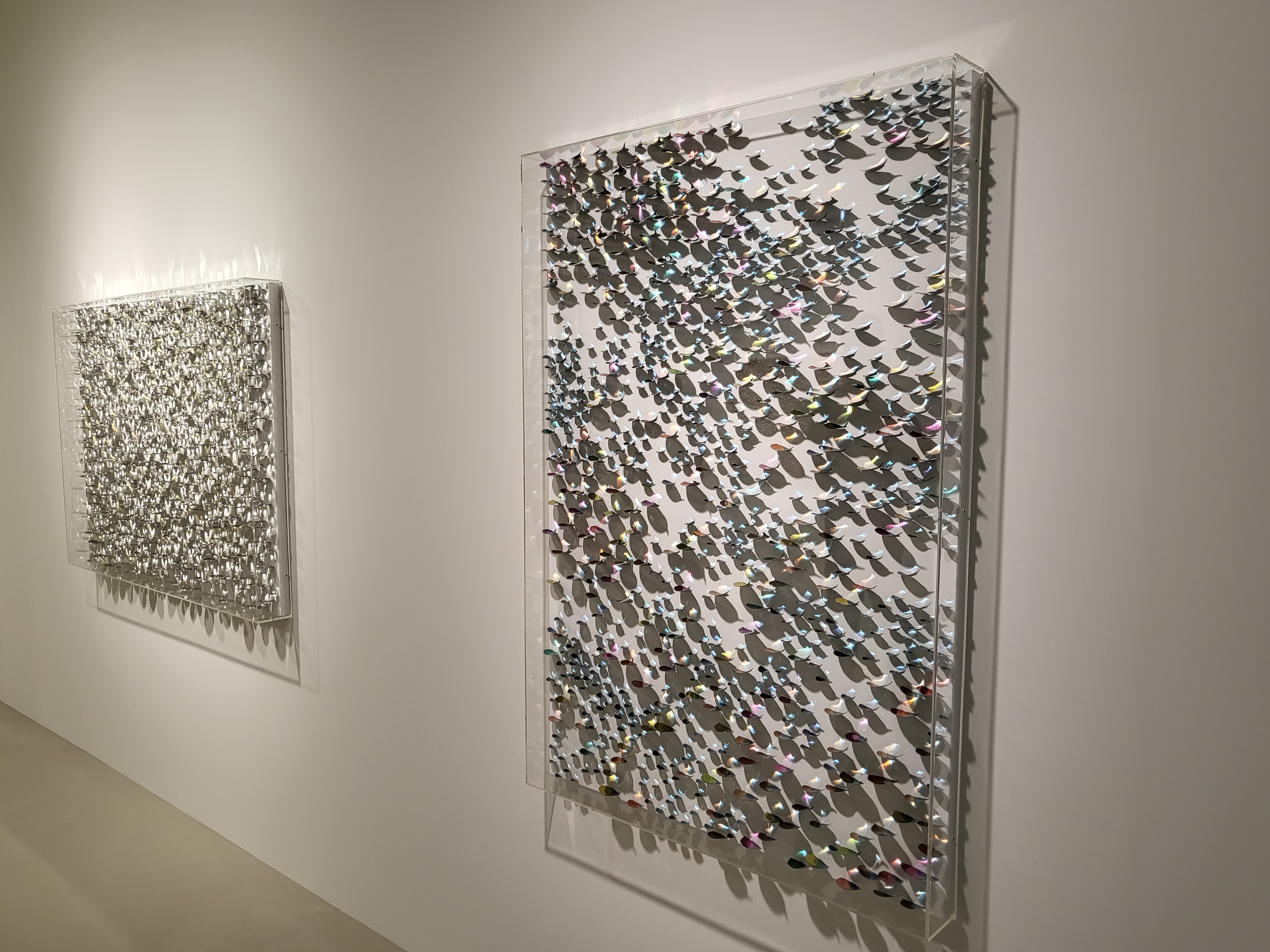 작가는 자신의 작품은 ‘빛’이라 언급한다. 하나의 작품을 완성하기 위해 빛을 도입하는 것이 아니라 그 자체가 재료이자 기법이며 표현이고, 빛을 그려내는 것이 아닌 화면 위에 그것이 머물 수 있도록 자리를 마련하는 것이 라 한다. 그는 조형적 아름다움을 세밀하게 쫓기 위해 수십, 수백 개의 스테인리스 스틸 유닛(unit)을 해머링 하 여 평평한 표면을 구부러뜨리는 작업을 한 후 안료를 안착, 캔버스 위 평면적인 공간에 고정하고 조명을 비춘다. 이때 스틸의 차가운 조각들은 아이러니하게도 빛을 만나는 순간 따뜻한 봄의 물결을 연상시키듯 각양각색의 빛 을 내뿜으며 하얀 캔버스 화면 위에서 황홀한 환상을 보여준다. 텅 비어있던 화면 위에 오묘하고 신비로운 일루 젼, ‘빛의 변주’가 나타나는 순간이다.