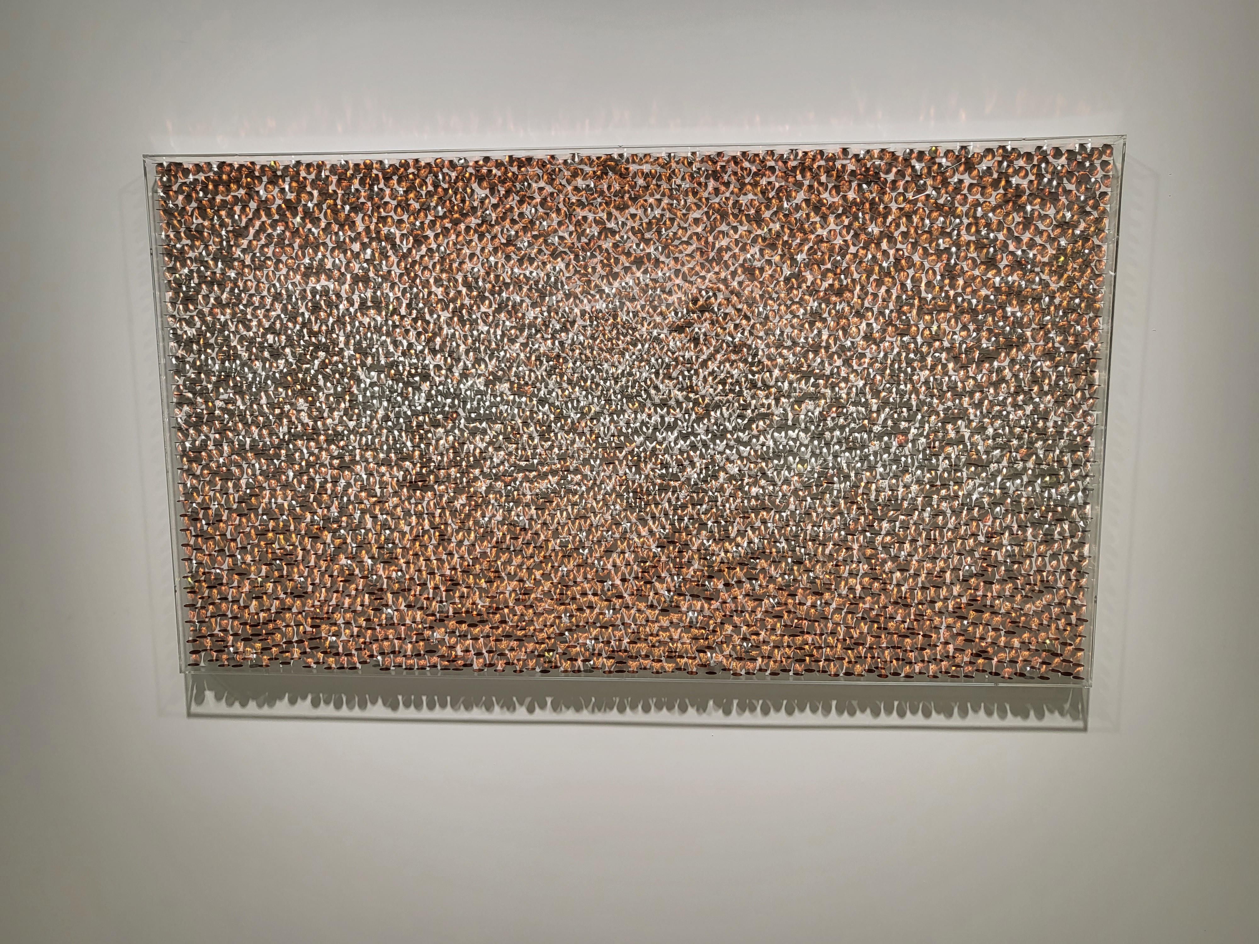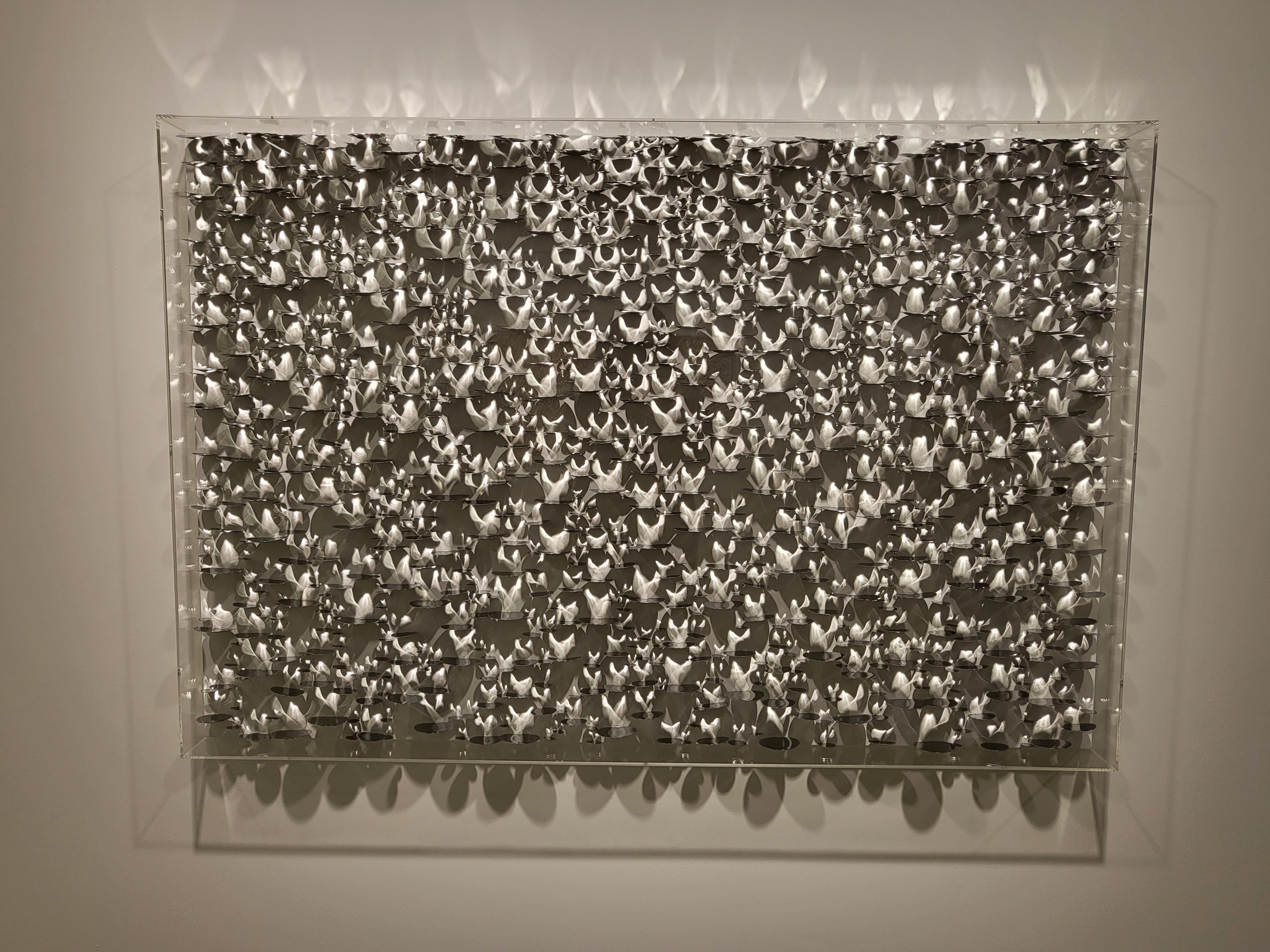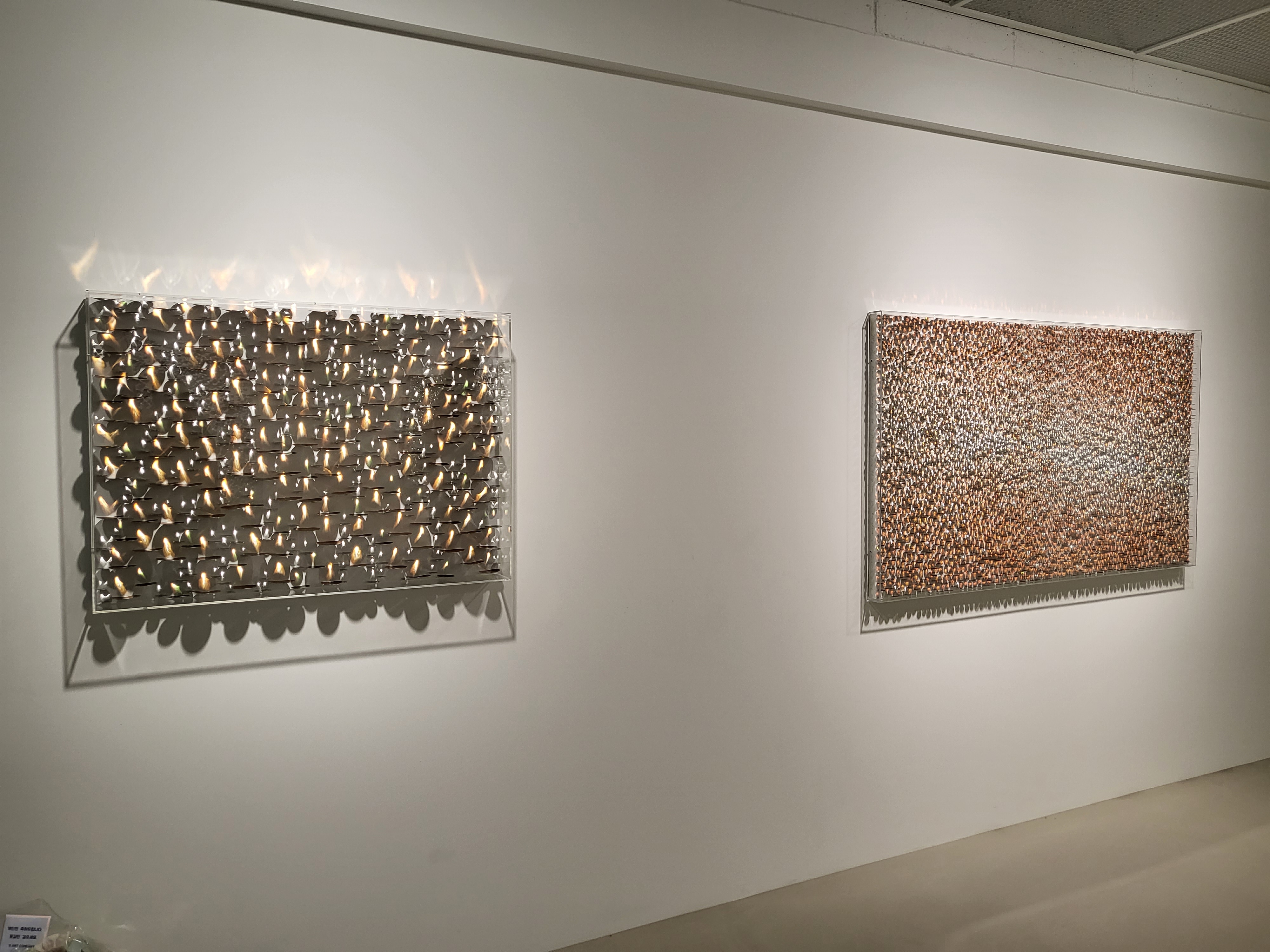 작가는 자신의 작품은 ‘빛’이라 언급한다. 하나의 작품을 완성하기 위해 빛을 도입하는 것이 아니라 그 자체가 재료이자 기법이며 표현이고, 빛을 그려내는 것이 아닌 화면 위에 그것이 머물 수 있도록 자리를 마련하는 것이 라 한다. 그는 조형적 아름다움을 세밀하게 쫓기 위해 수십, 수백 개의 스테인리스 스틸 유닛(unit)을 해머링 하 여 평평한 표면을 구부러뜨리는 작업을 한 후 안료를 안착, 캔버스 위 평면적인 공간에 고정하고 조명을 비춘다. 이때 스틸의 차가운 조각들은 아이러니하게도 빛을 만나는 순간 따뜻한 봄의 물결을 연상시키듯 각양각색의 빛 을 내뿜으며 하얀 캔버스 화면 위에서 황홀한 환상을 보여준다. 텅 비어있던 화면 위에 오묘하고 신비로운 일루 젼, ‘빛의 변주’가 나타나는 순간이다.