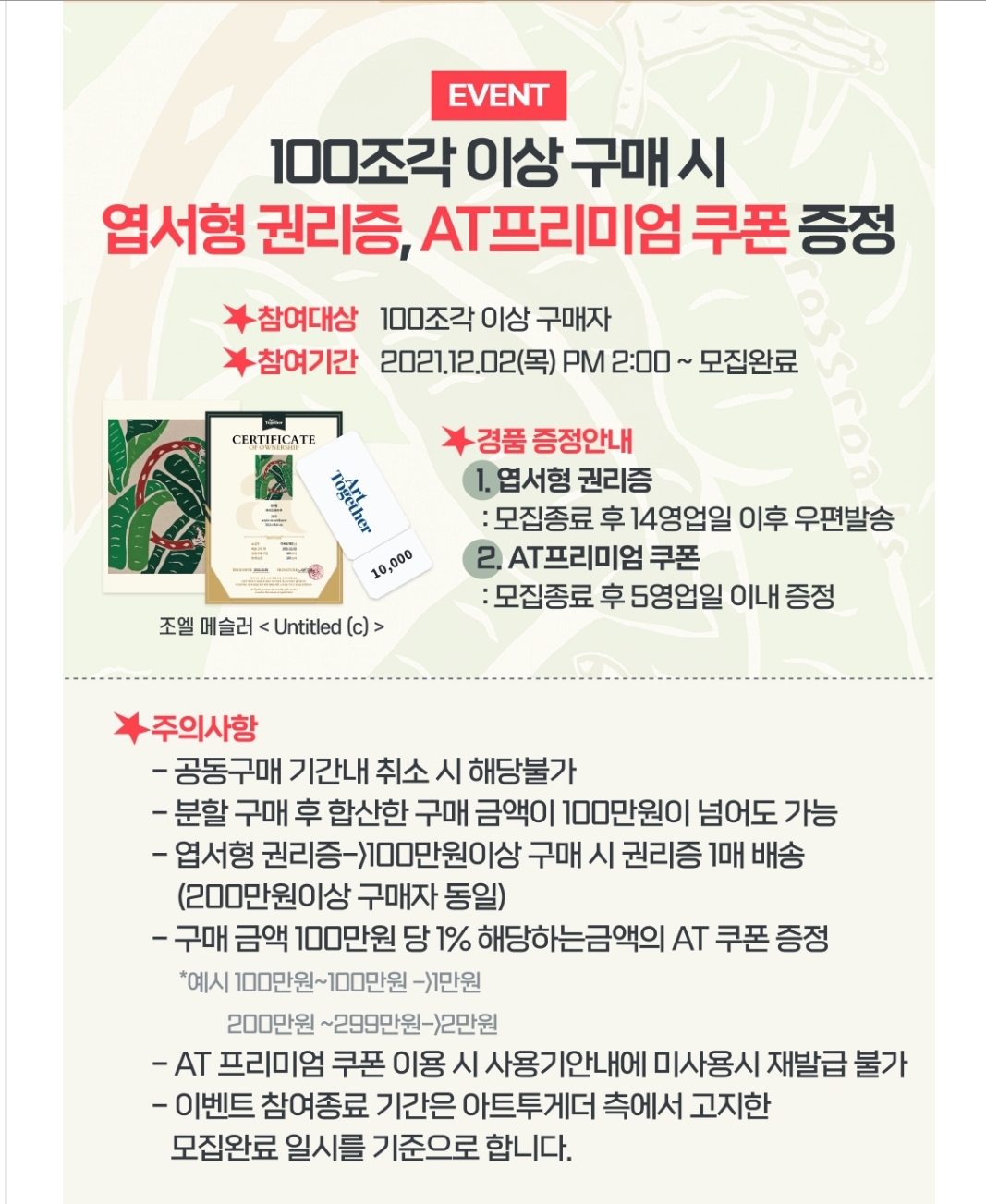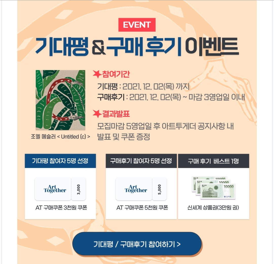 아트투게더에서는 1) 기대평 & 구매후기 이벤트와 2) 100조각 이상 구매시 엽서형 권리증 증정 이벤트를 진행합니다.