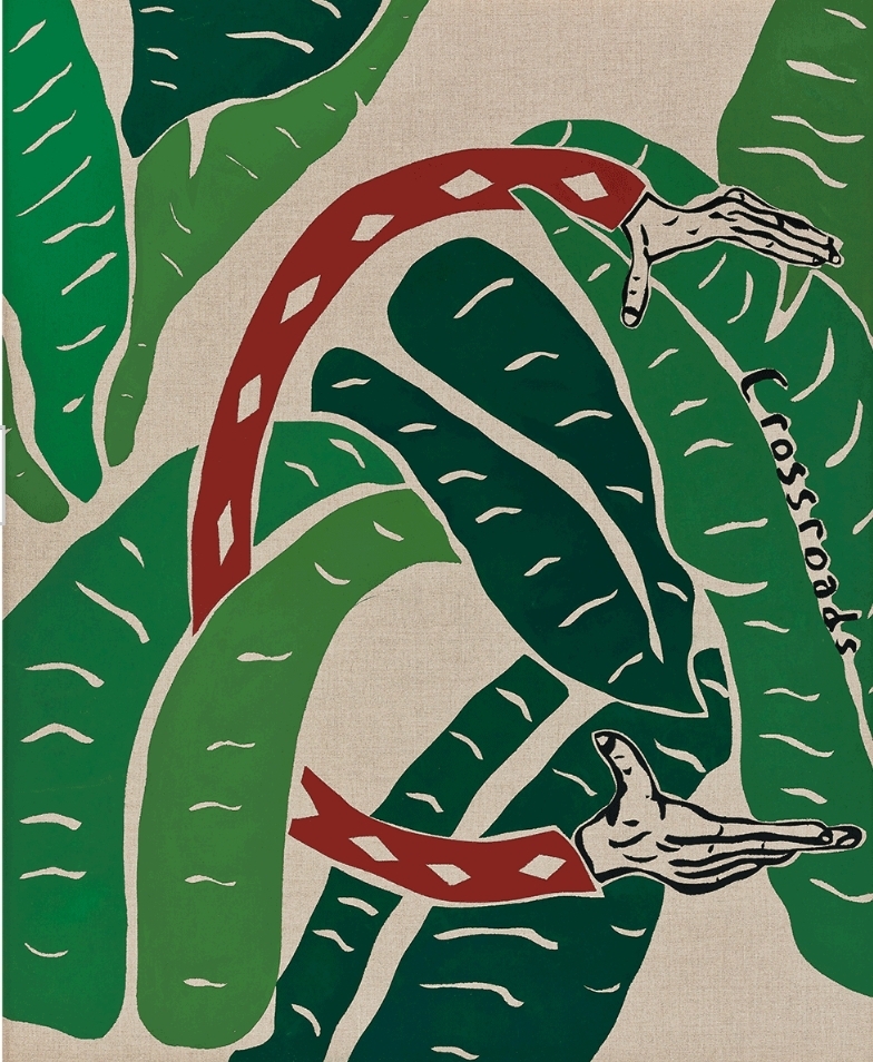 커다란 나뭇잎 사이로 양 손이 Crossroads 문구를 잡으려고 하는 것처럼 보입니다. 아니면 보호 하려고 하는 걸까요?