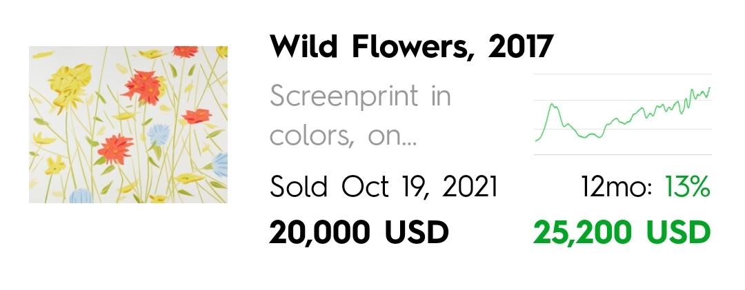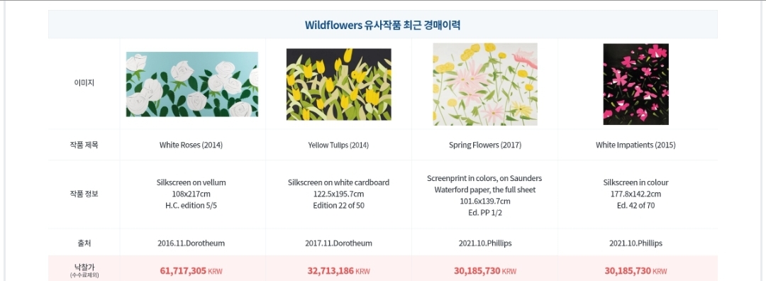 아트투게더에서 공동구매하는 Wildflowers 작품은 15/20 A.P. 에디션으로 2021년 옥션에서 1400만원에 거래된 이력이 있습니다.