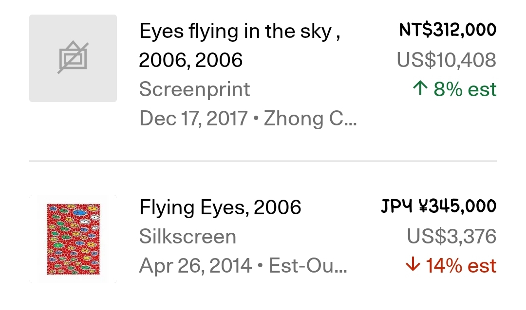 LiveArt의 데이터를 보면 Eyes Flying in the Sky 작품은 지난 12개월 동안 24% 상승한 것을 알 수 있습니다.